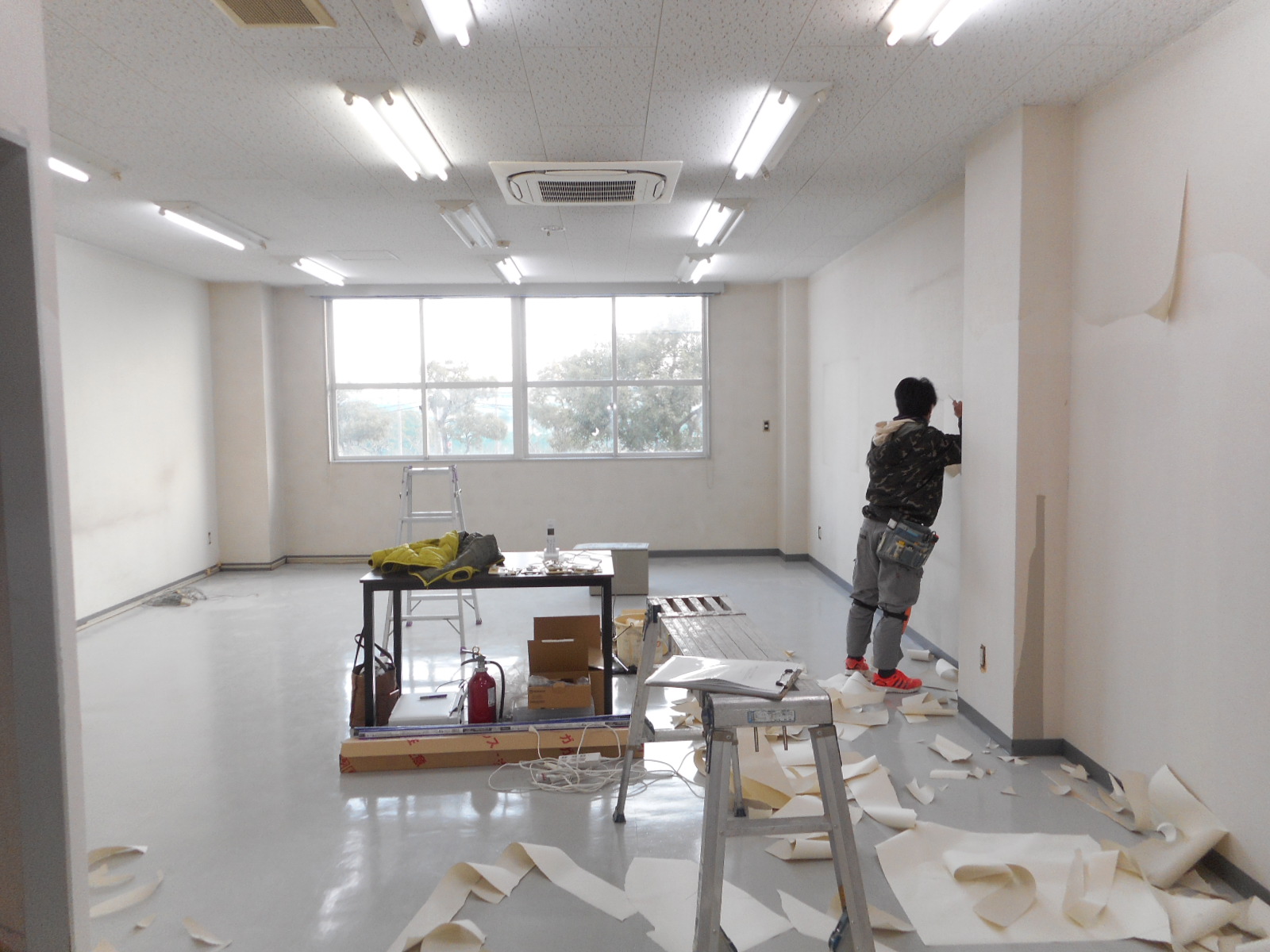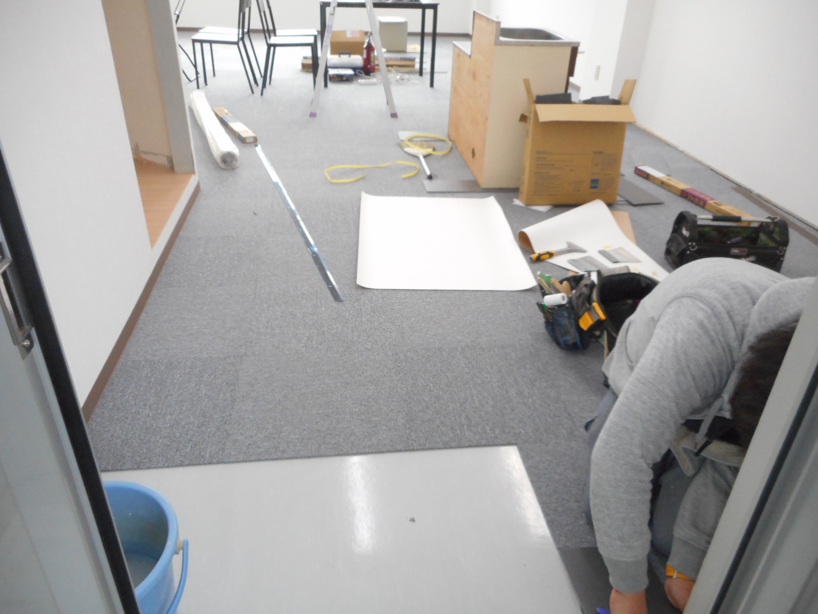 | 壁のクロスを剥ぎ取り、新規のクロスを張ります!! | 床に、タイルカーペットを施工して行きます!! |