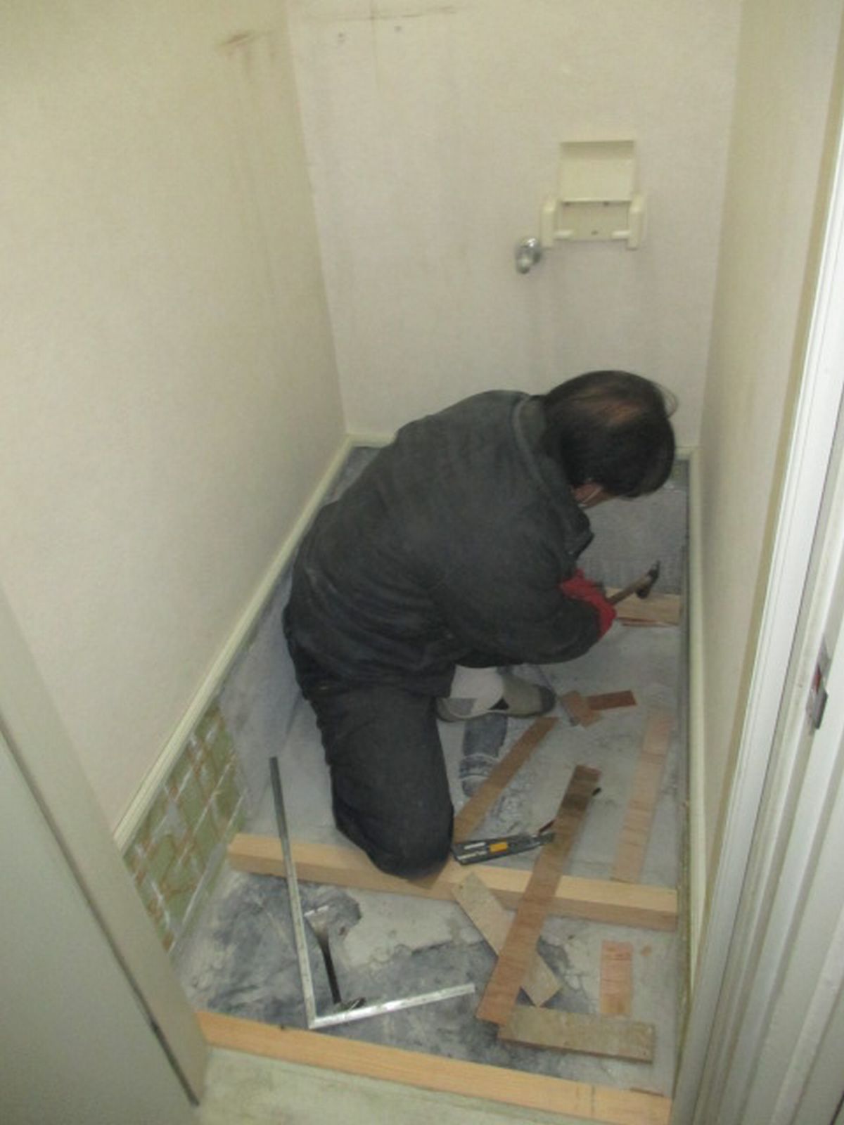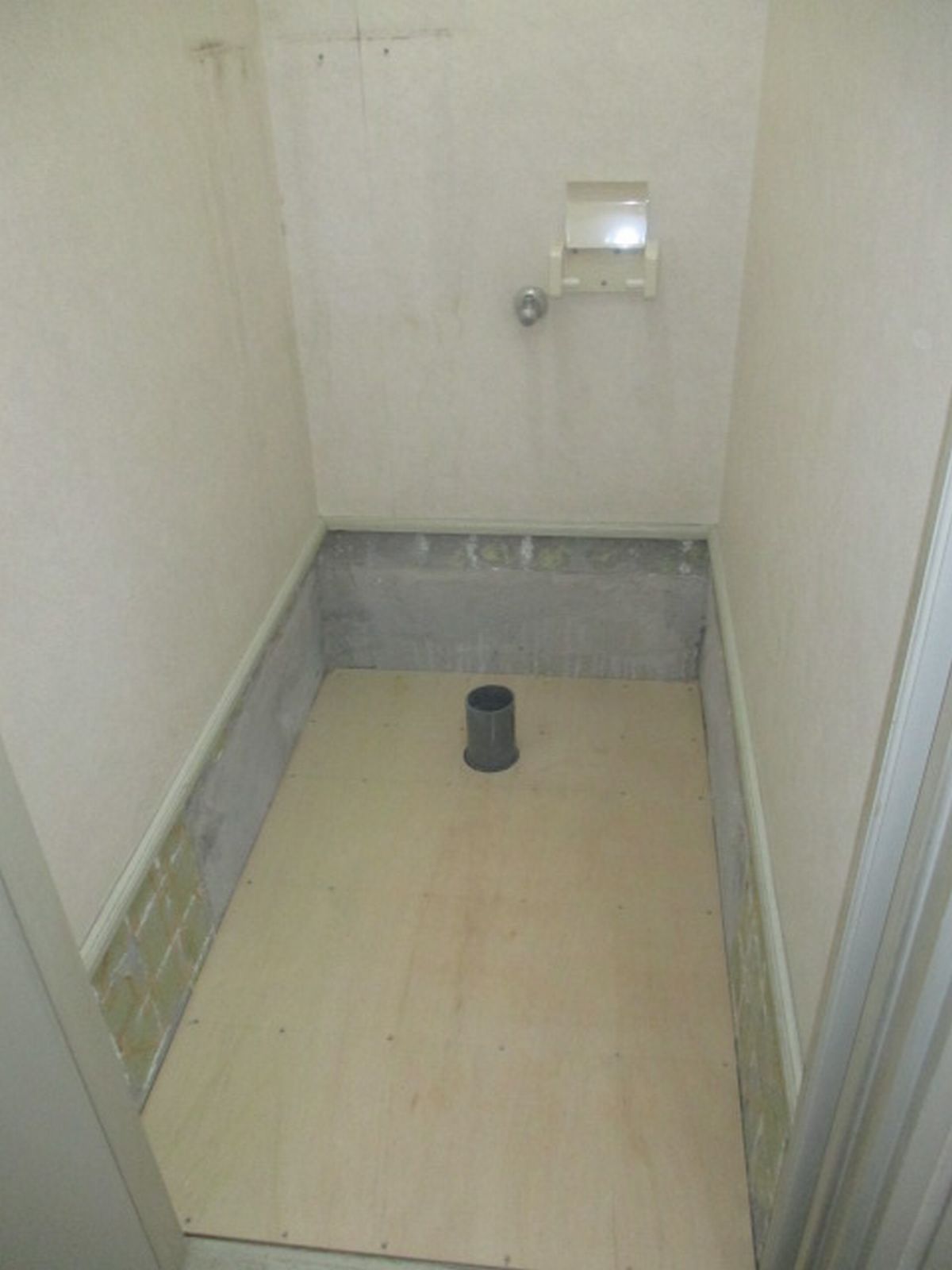 | 既設便器を撤去後、床も解体しました!! | 下地整備後、CF下地のコンパネを施工しました!! |