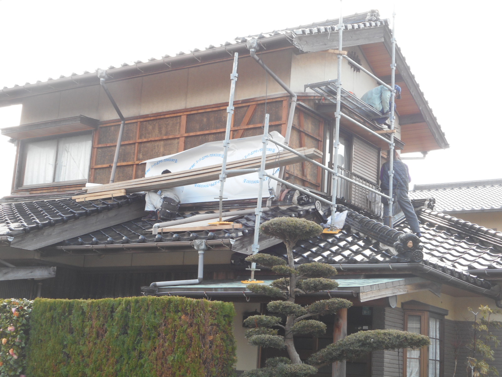| 既存の外壁を解体,撤去後、以前は施工されていなかった透湿、防水シートを施工します!! | 新規の外壁(焼き杉)を、施工して行きます!! |
