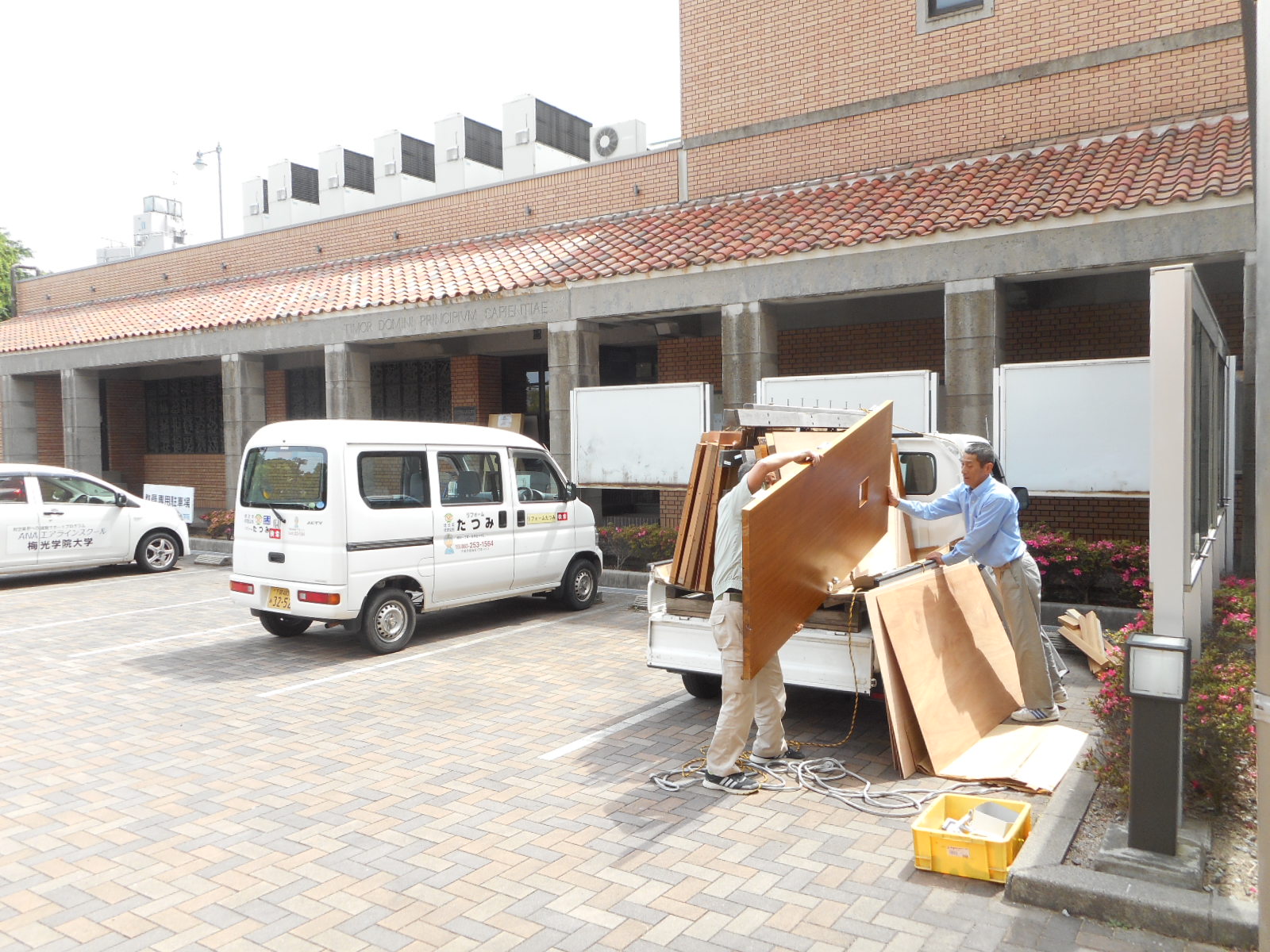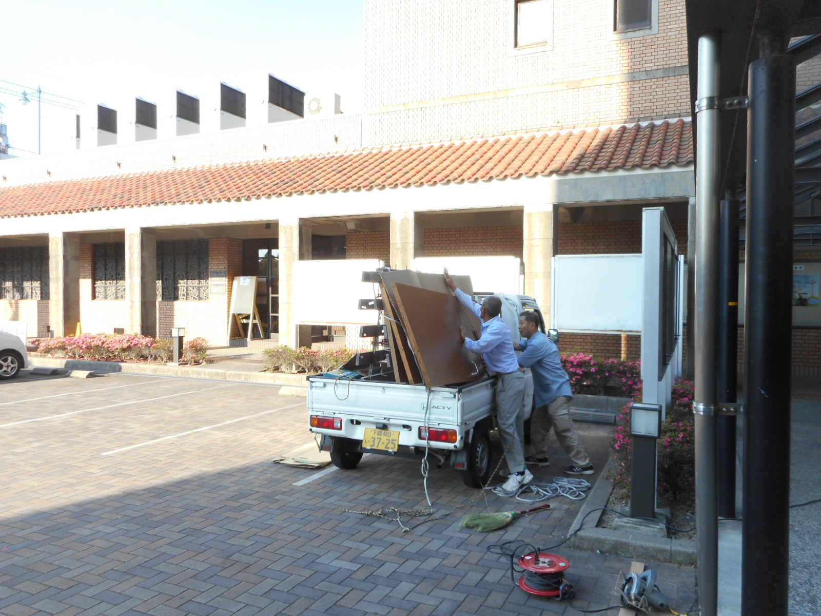 | 事務室と言うことで、個人情報の問題があるため、外から人が入れない様にバリケートをします!! | 工場で改修工事をするため、車に積んで持ち帰ります!! |