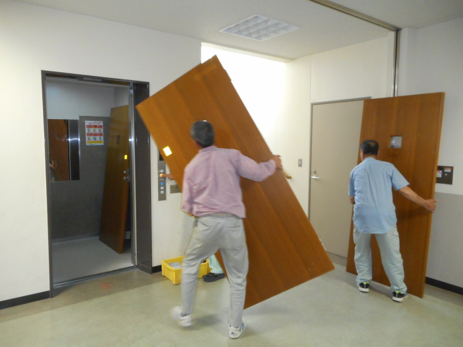 | 4階のため、エレベーターで下ろします!! | 車に積込んで、工場へ持ち帰ります!! |