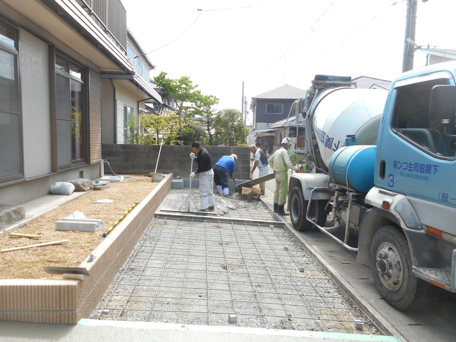 | 生コンを、打設します!! | 生コンの打設後、しばらく乾かして金コテで押さえて仕上げます!! |