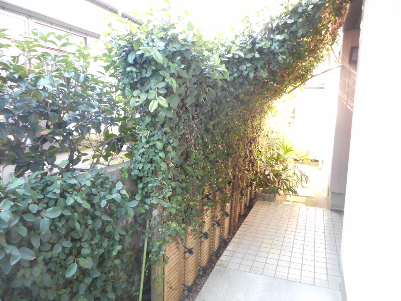 現在は玄関前の、お隣との境界には生垣が植えられており、それが目隠しの役目をしていますが