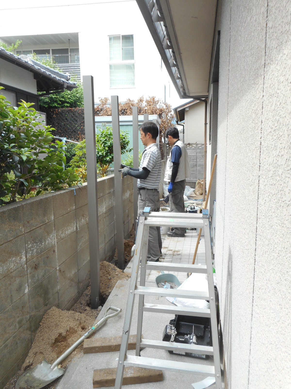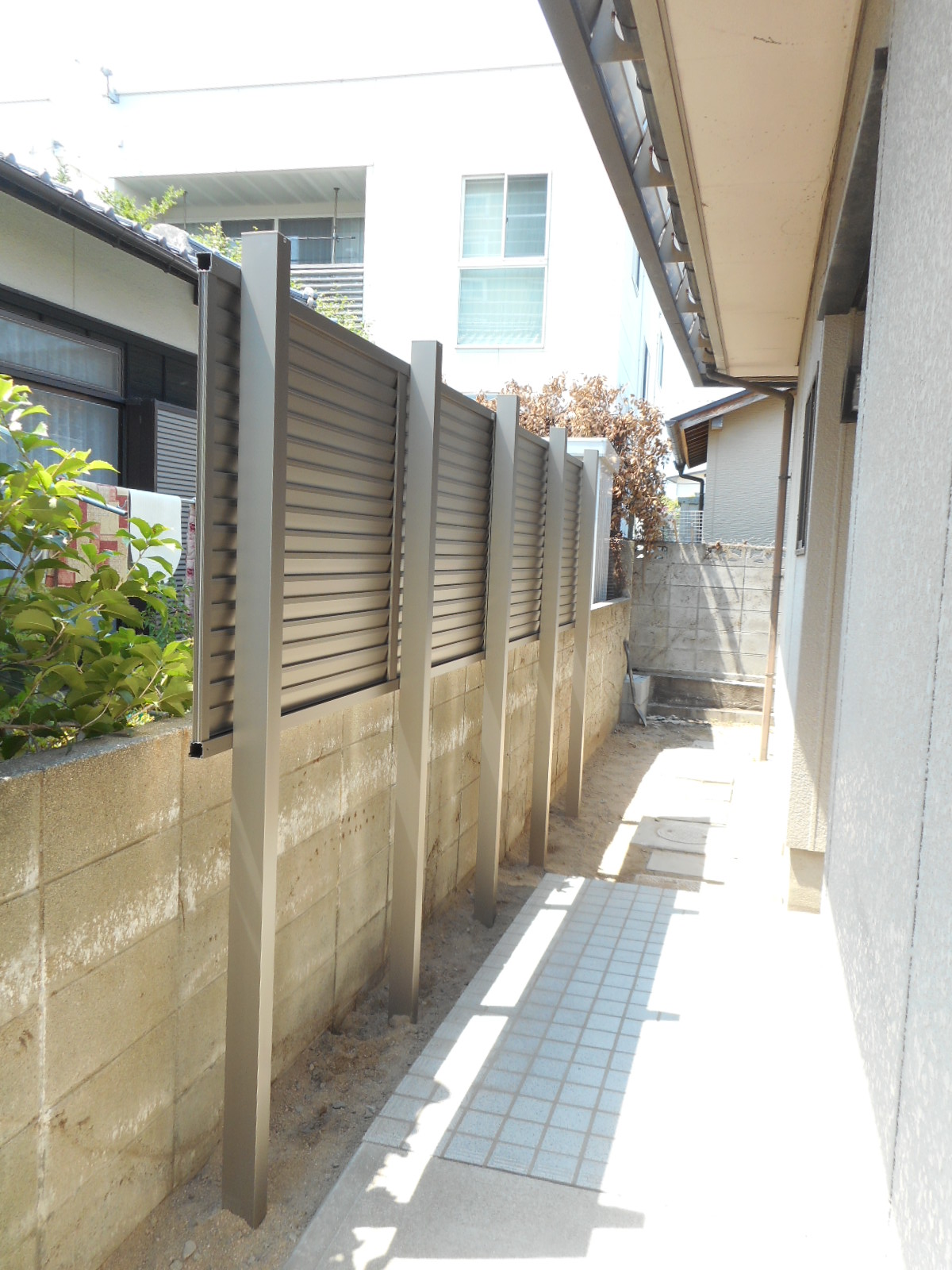 柱の外側にT-10の目隠しフェンスを幅4m取付け、上の*アフターの様に完成しました。
