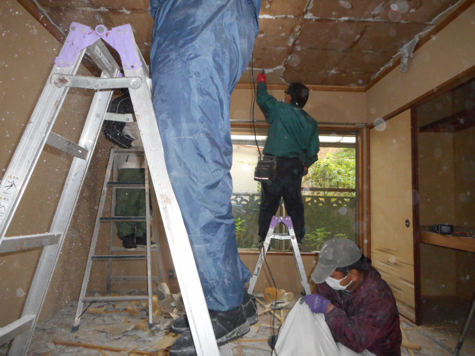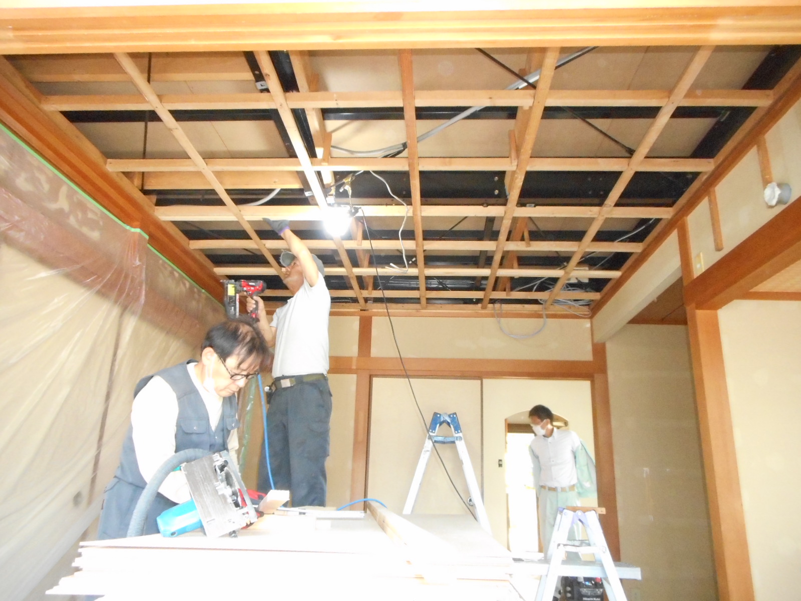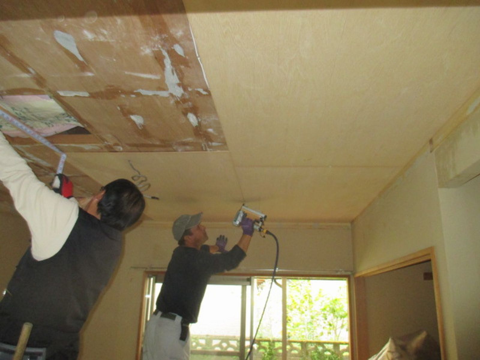 天井材を、解体します!! 下地補修後、クロス下地のベニヤを施工します!!