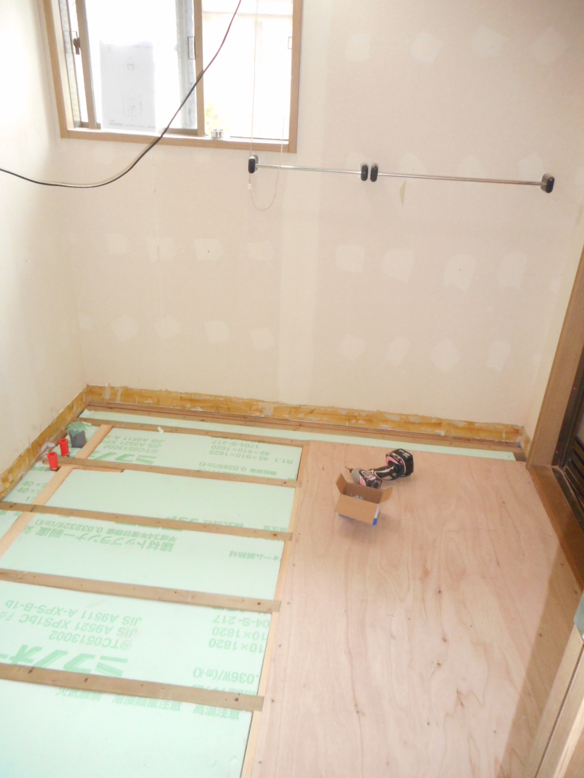 床は畳を撤去後、下地づくりをします!! 捨て張りコンパネを施工後、新規のフロア材を施工します!!