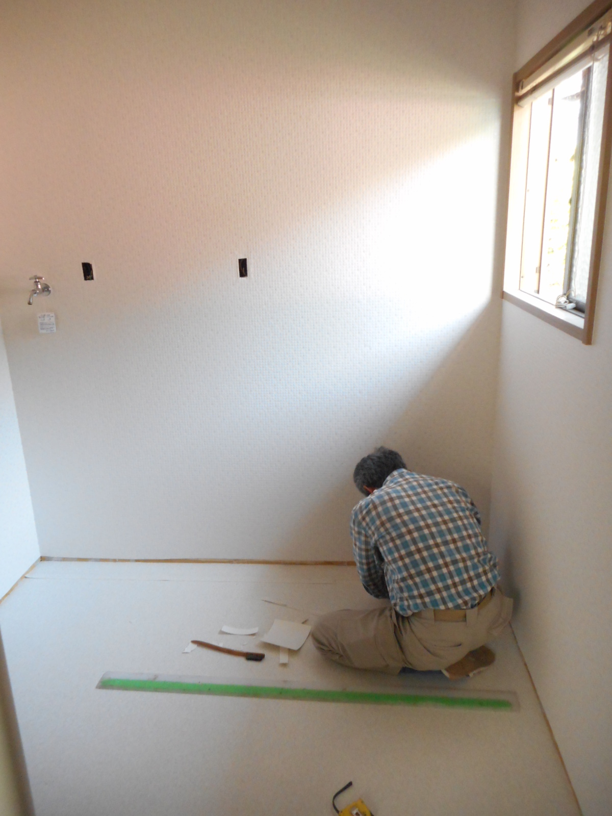 床を解体後、新規化粧台用の給排水管を移設,整備し内装の下地づくりをします!! 天井&壁のクロス張替えと床にCFを施工しています!!