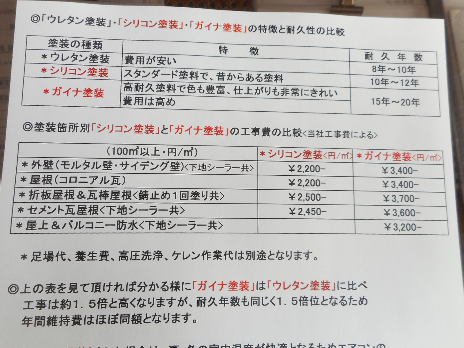◎*「ウレタン塗装」・*「シリコン塗装」・*「ガイナ塗装」の特徴と耐久性の比較。