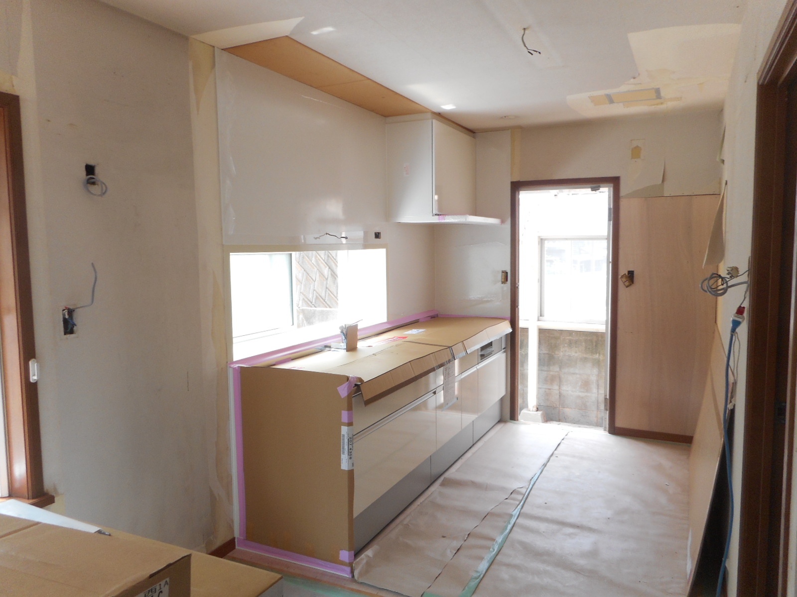 *キッチン側!!(キッチンの組立ても終わり、天井や壁廻りの補修も終わりました)