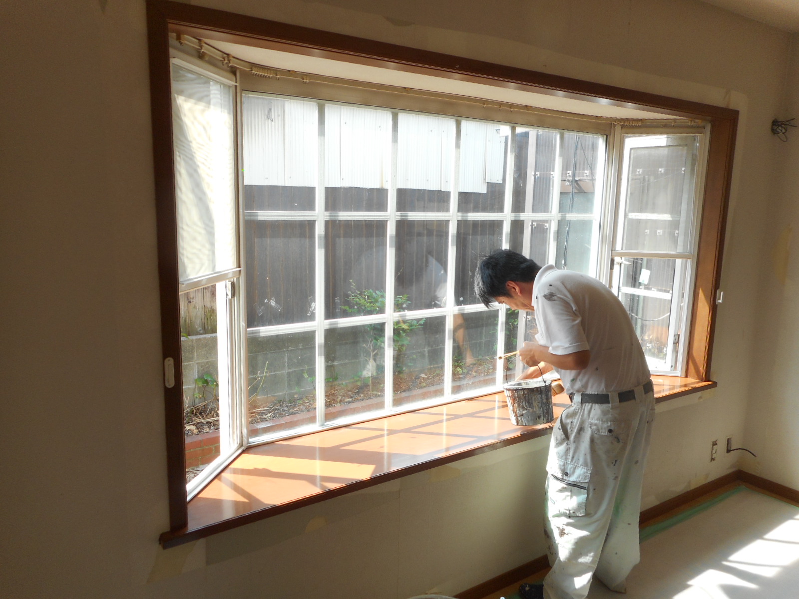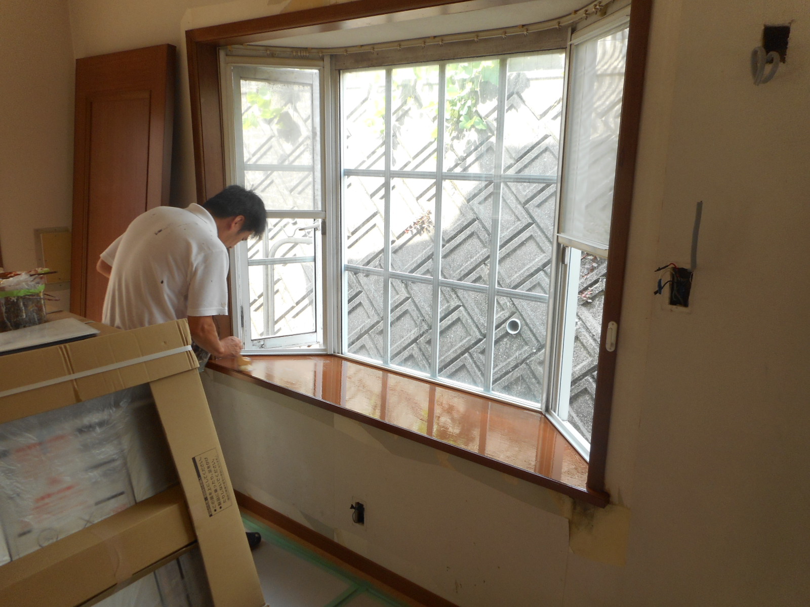 | キッチンの出窓カウンターを、塗装しています!! | リビングの出窓カウンターを、塗装しています!! |