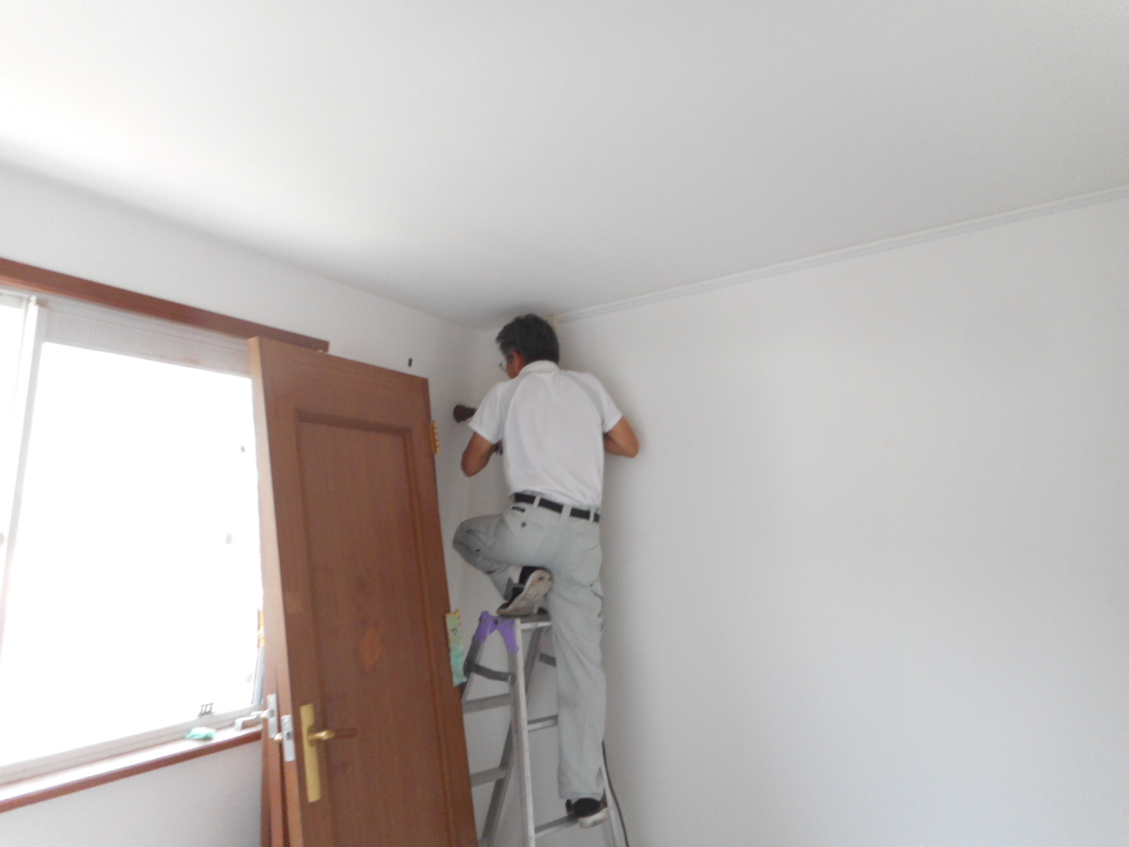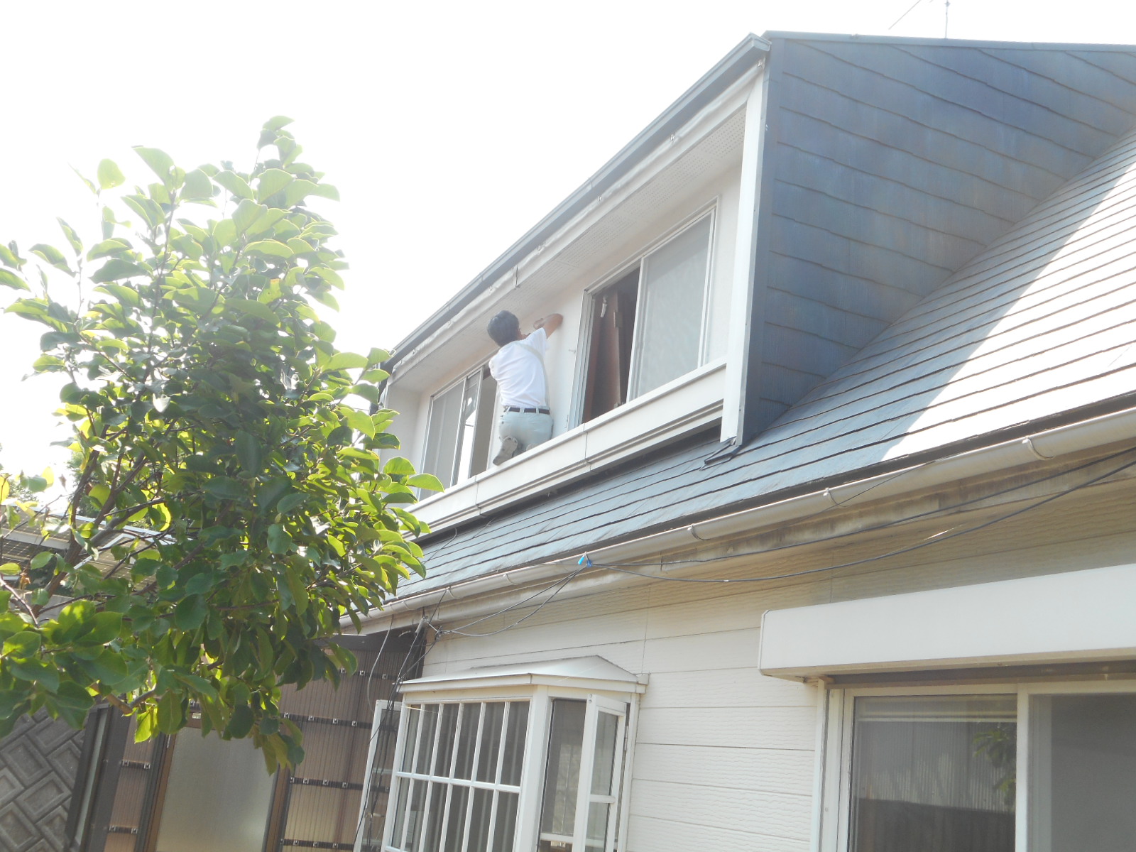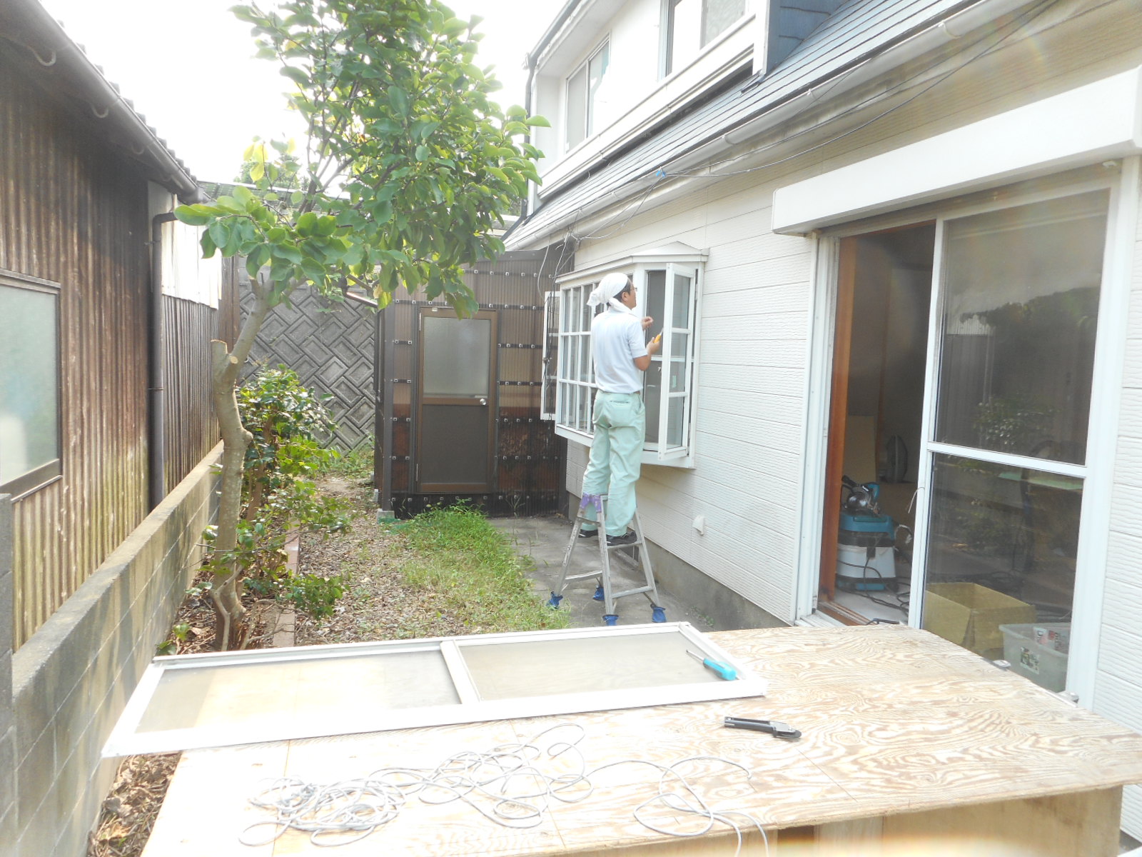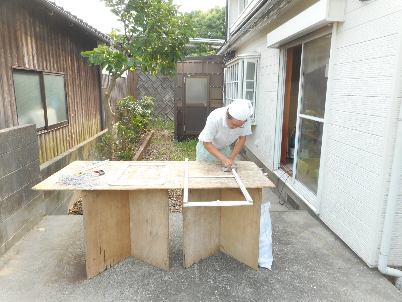 | 出窓の網戸の、張替えをしています!! | 張替えた網戸を、収めています!! |