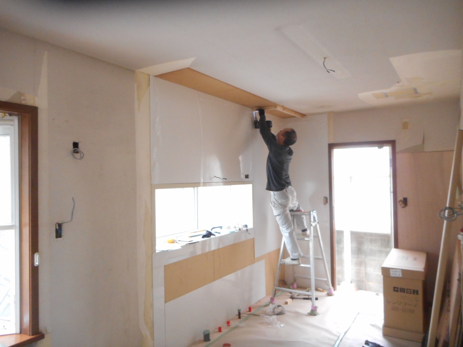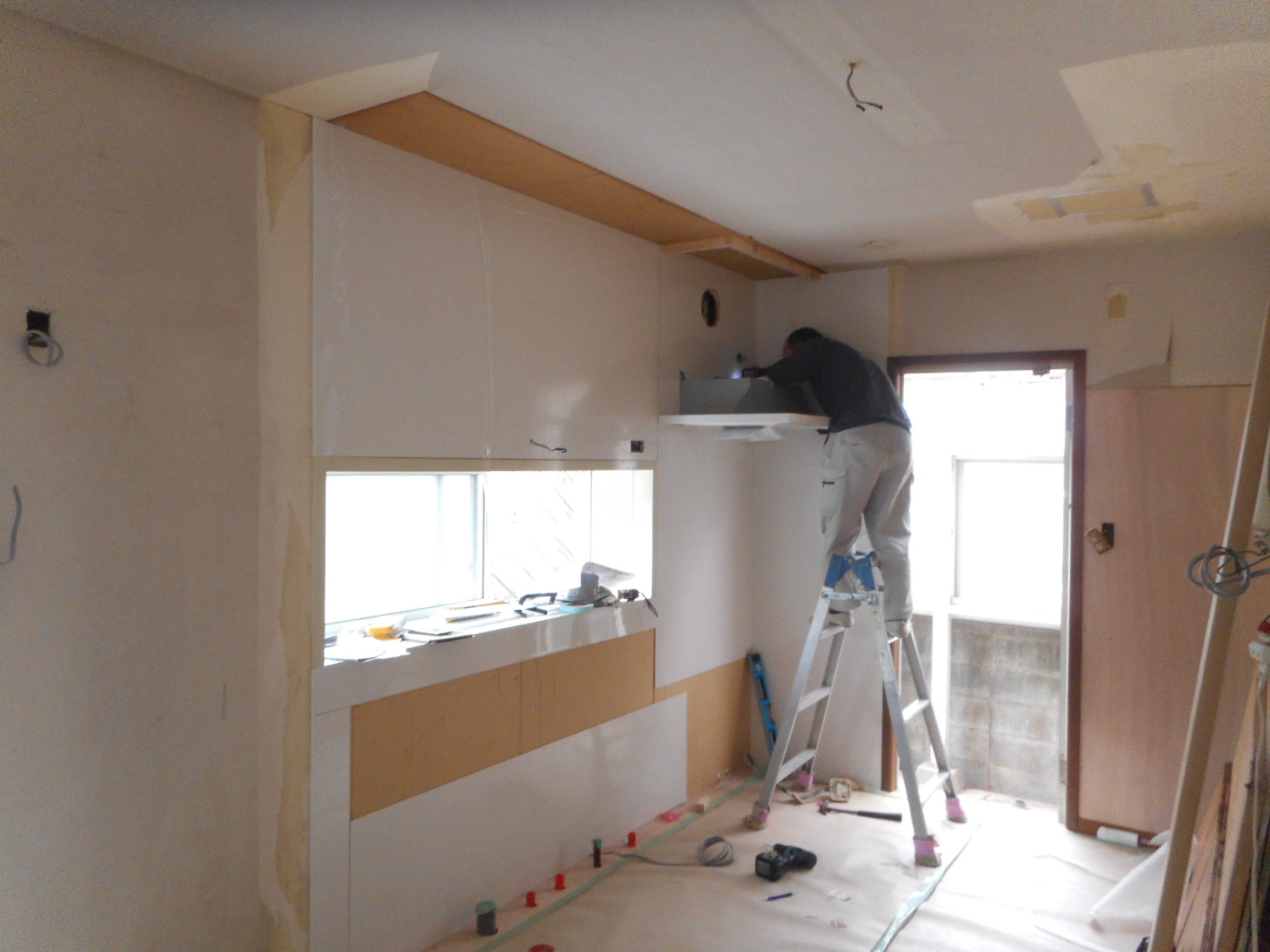 | レンジフードを取付けるための、下地を造ります!! | レンジフードを、組付けます!! |