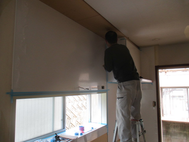 | キッチンパネルを、張って行きます!! | 慎重に張ります!! |