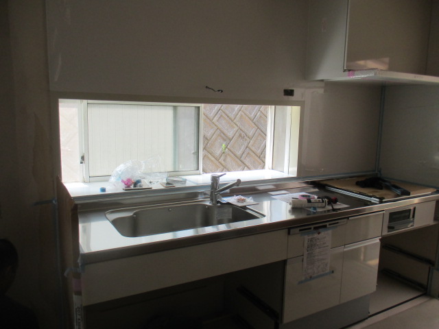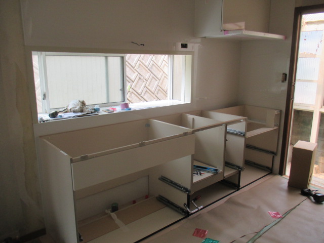 | IHを、組み込んでいます!! | 水栓金具も取付け、引き出しも順次組み入れます!! |