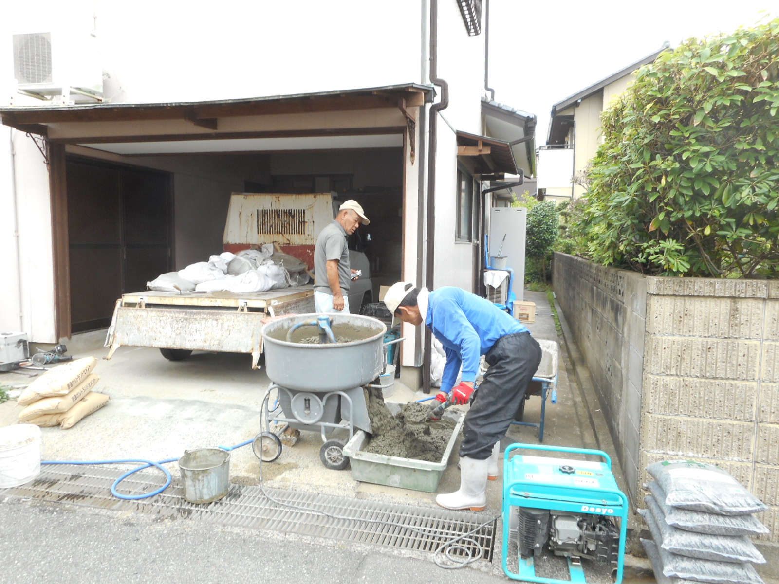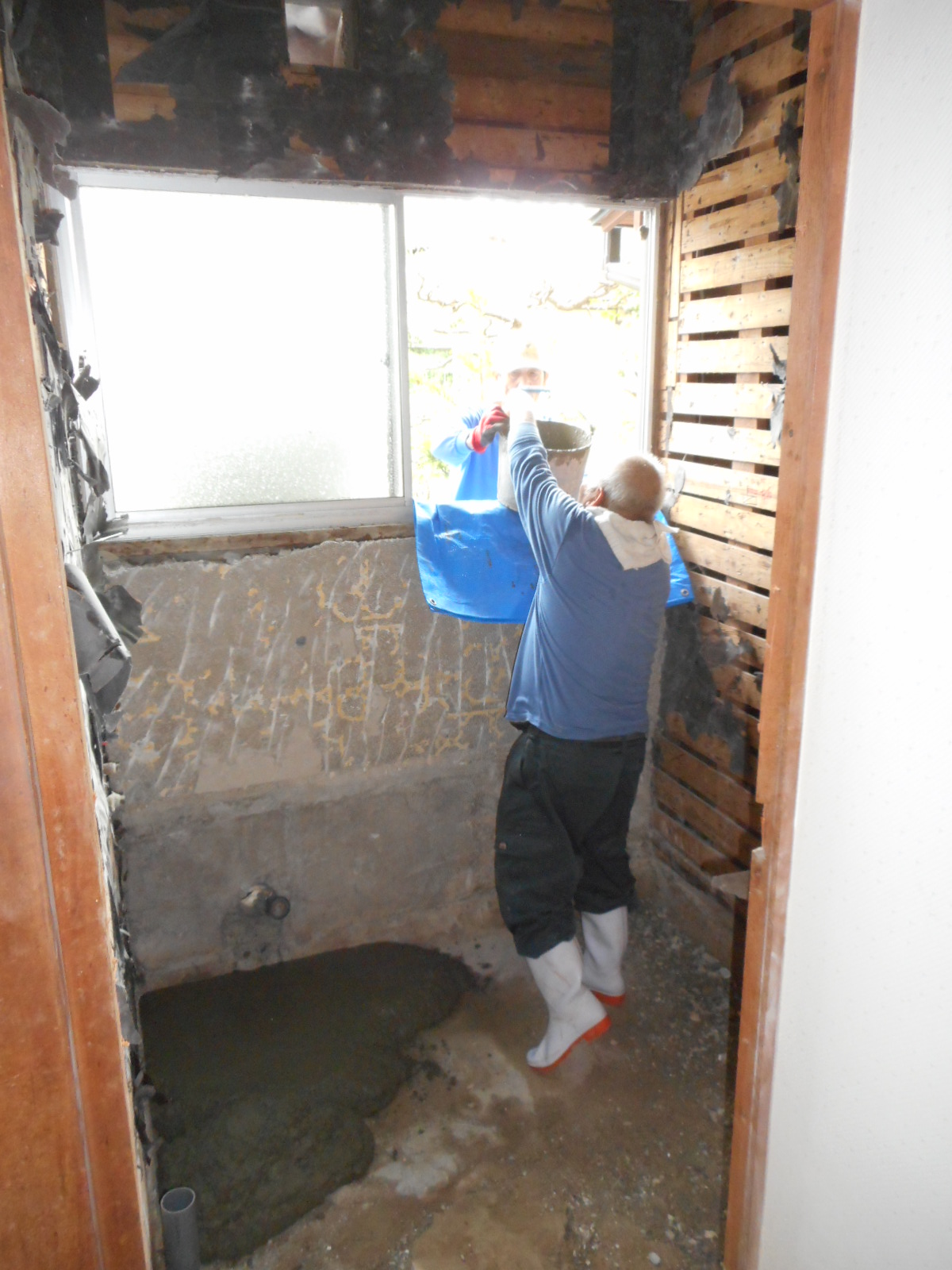 | 外で練った生コンを、窓から入れます!! | 順次生コンを、打って行きます!! |