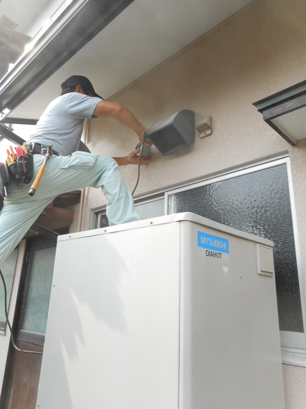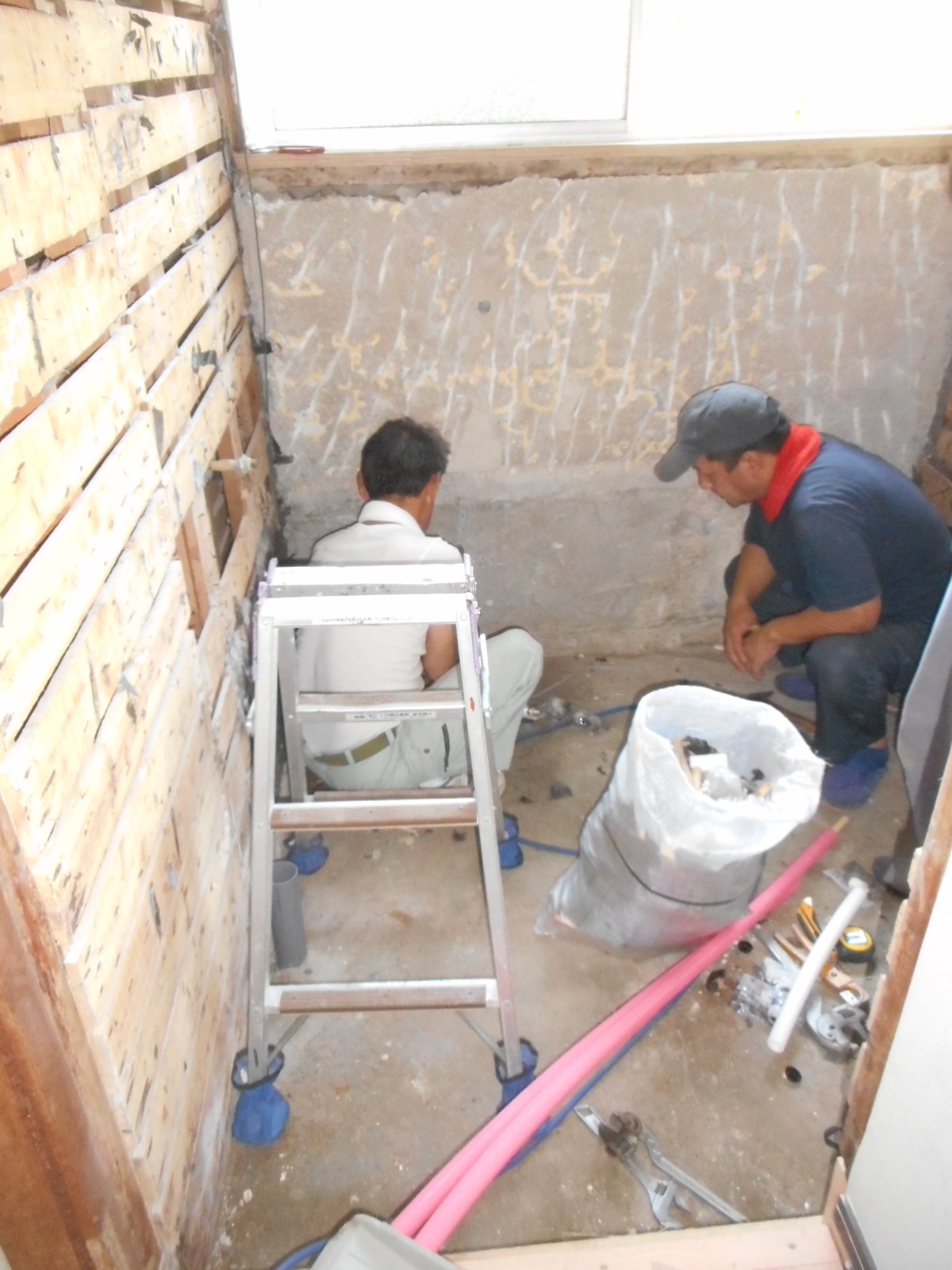 | 設備屋さんが給水、給湯管の整備をします!! | 電気屋さんが、換気フードの工事をします!! |