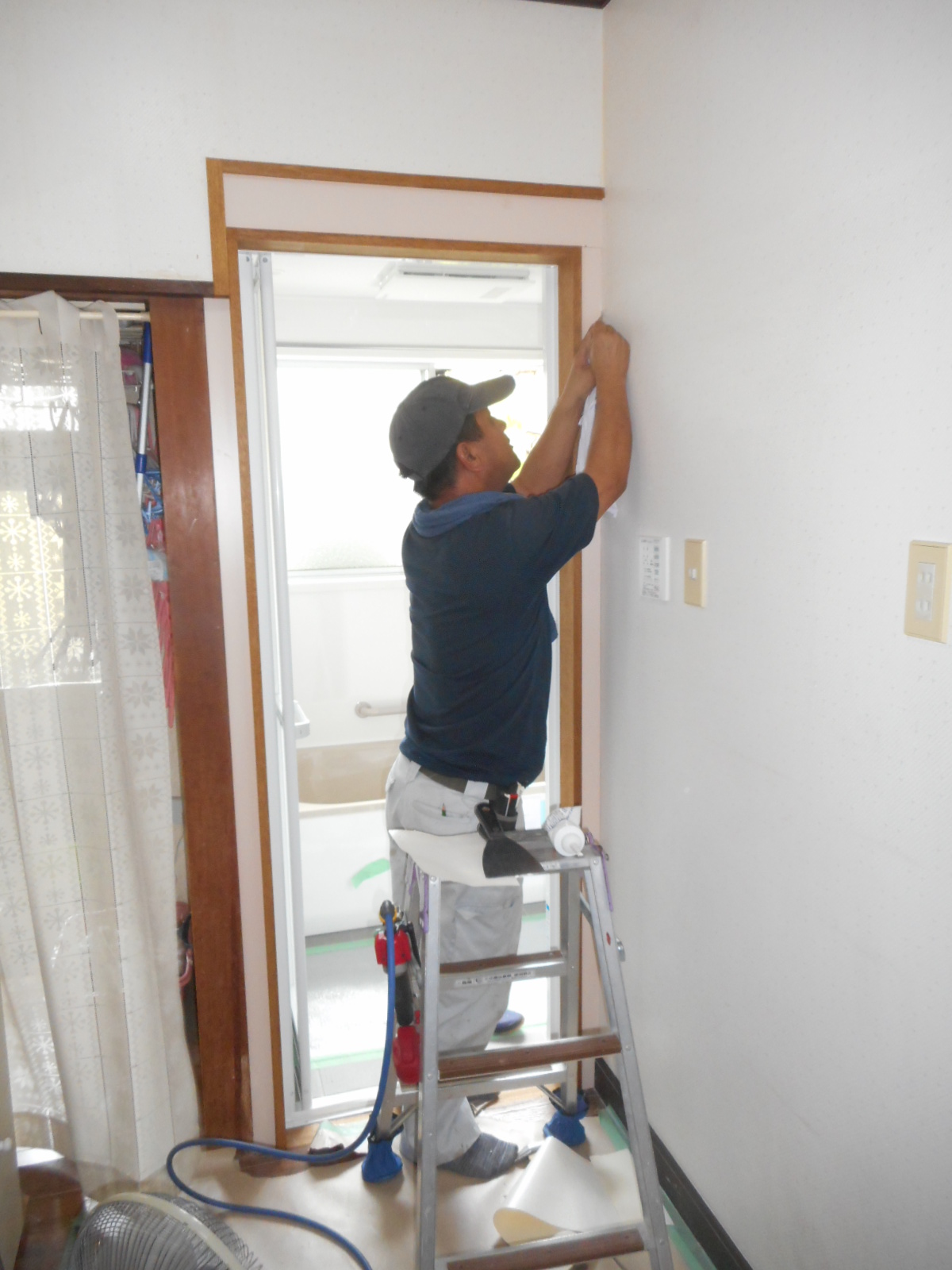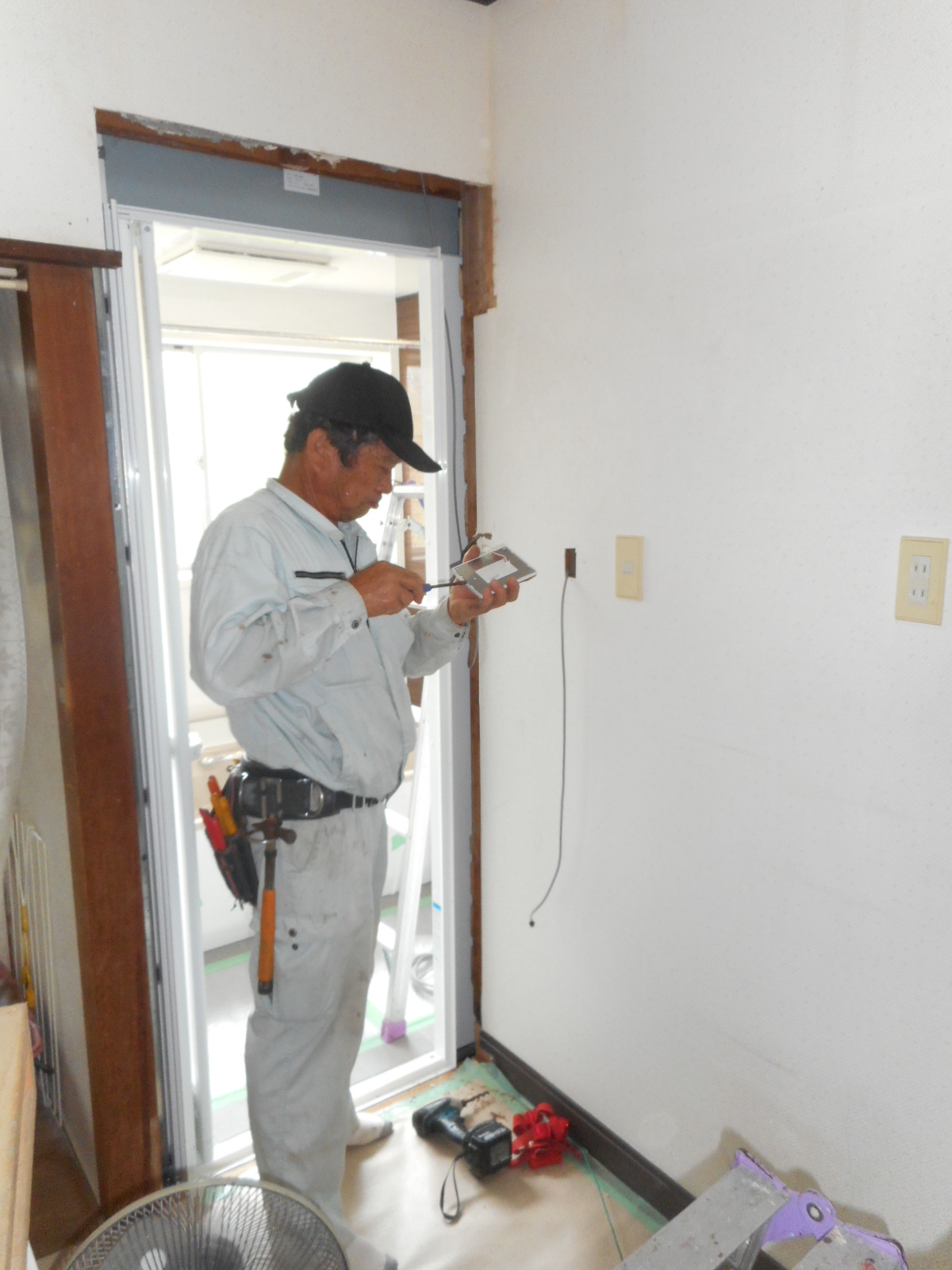 | 電気屋さんが、浴室リモコンを取付けます!! | 入り口に、換気機器のリモコンを取付けます!! |