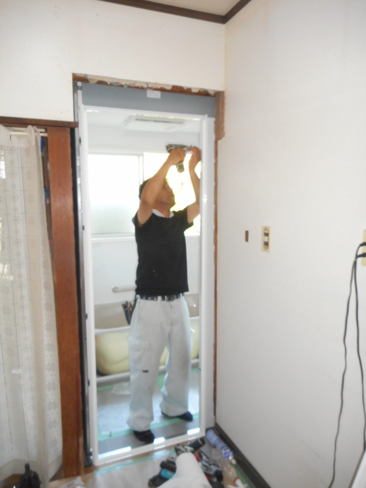 | 入り口の折れ戸を、取付けます!! | ハンドバーや風呂フタフックも、取付けました!! |