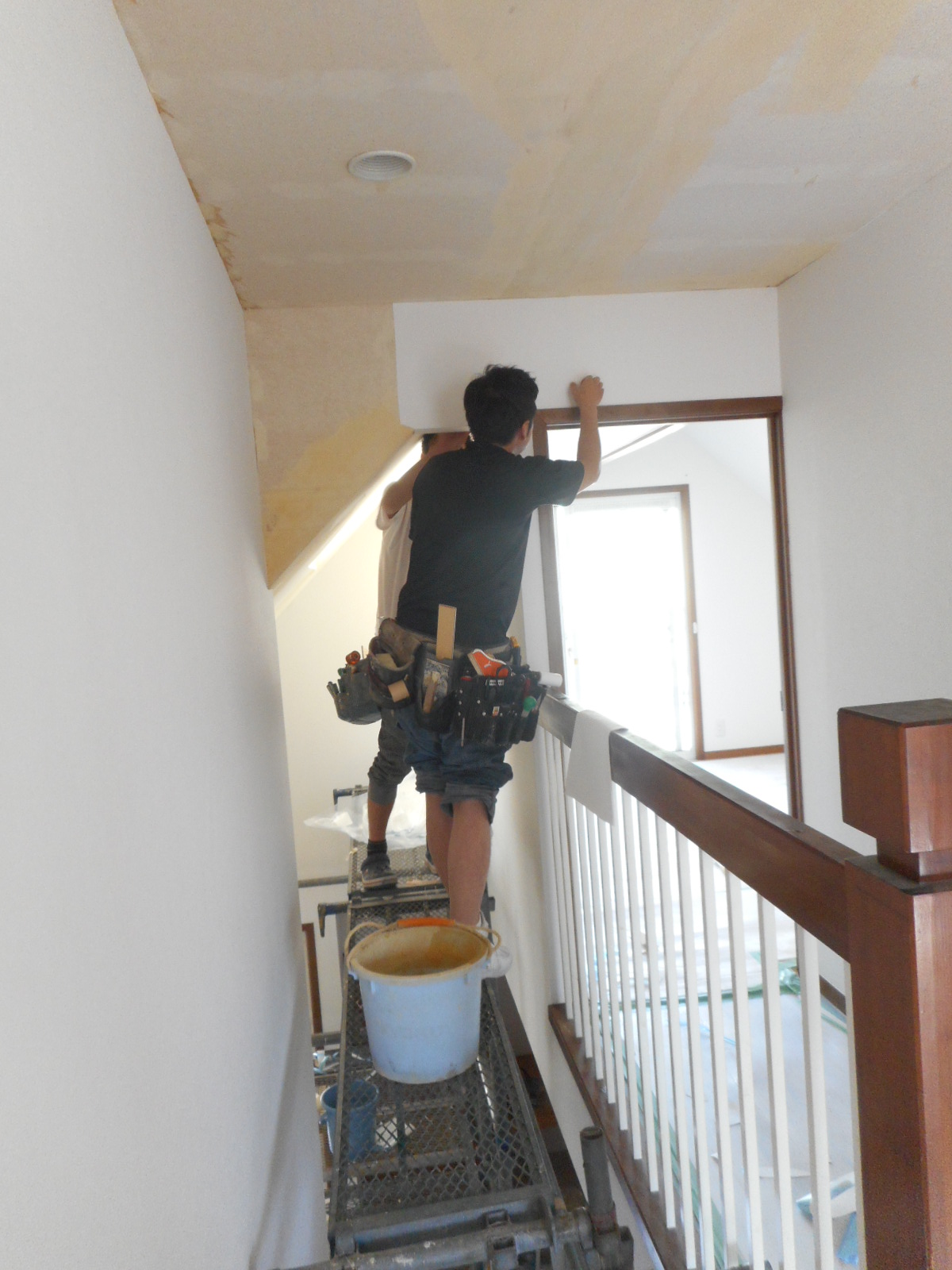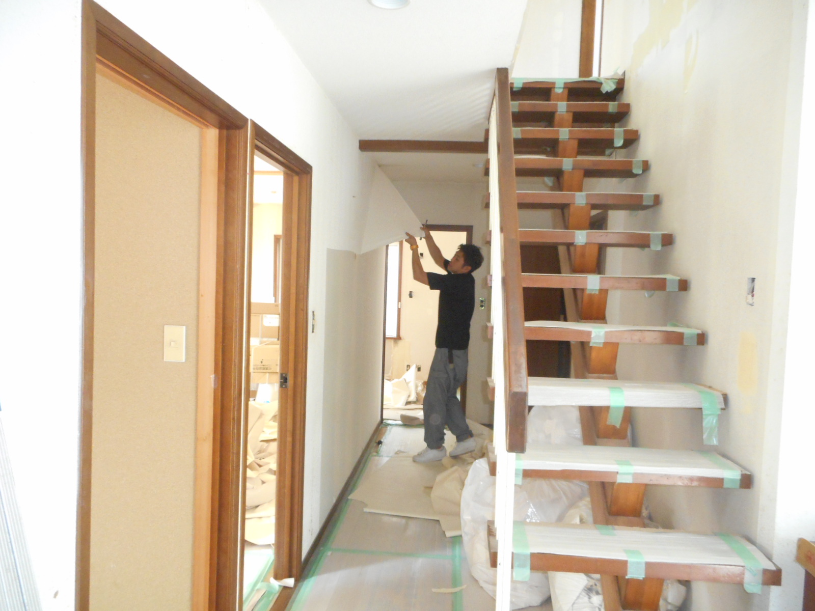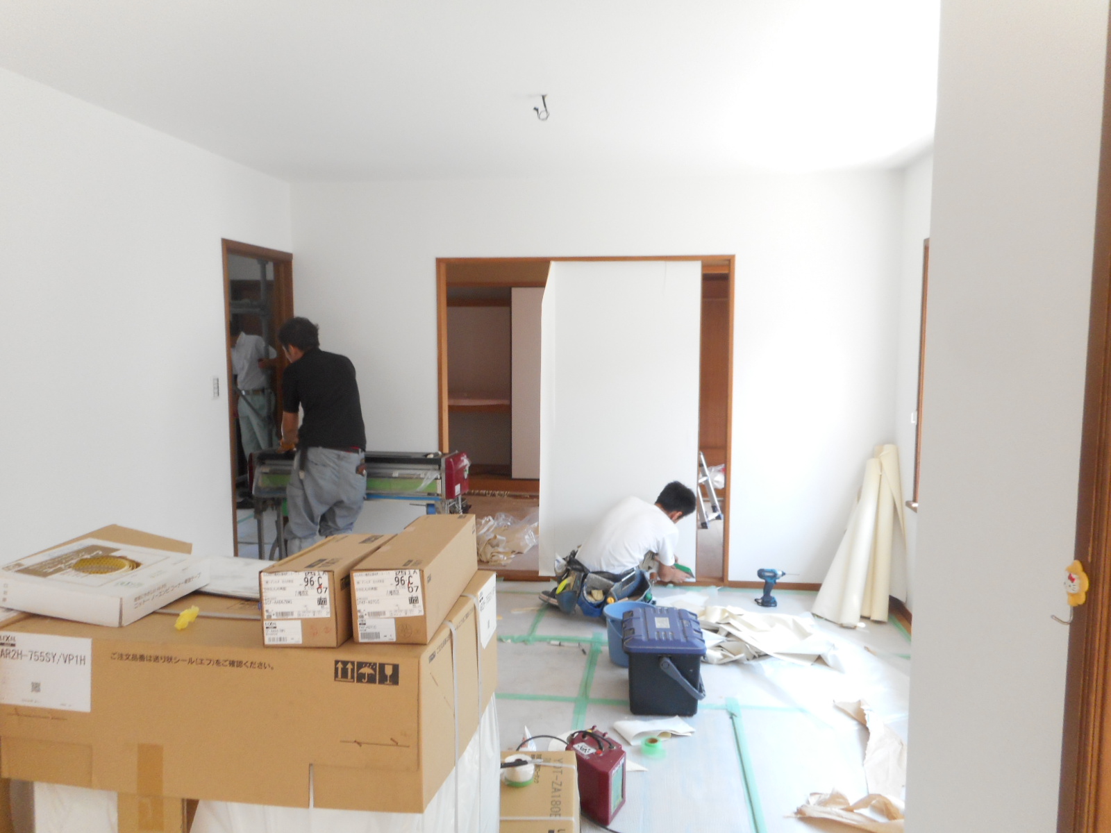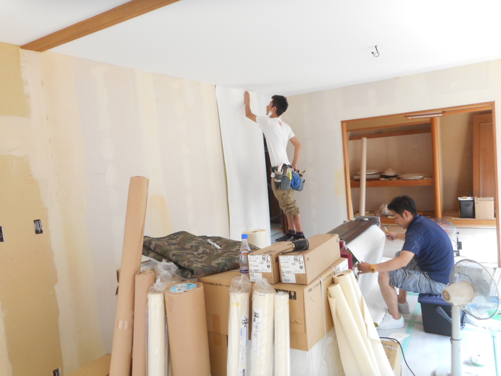 既存のクロスを剥いでいます!! 新規のクロスを張っています!!