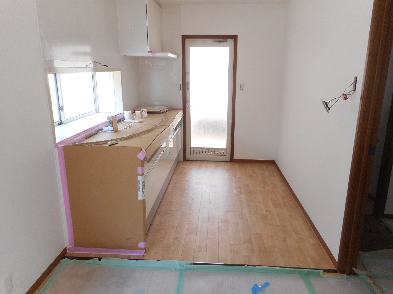 ビフォー!!  アフター!!(天井&壁廻りはクロスを、キッチン前の床にはCFを張りました)