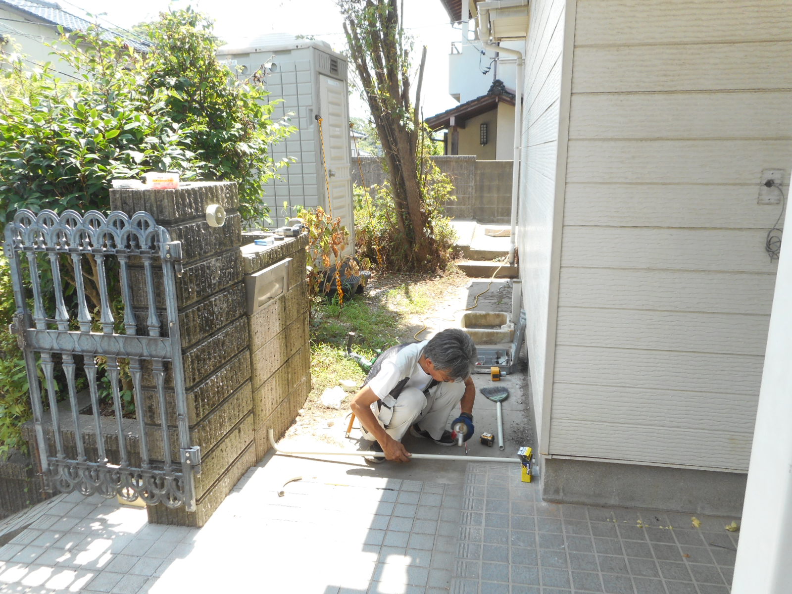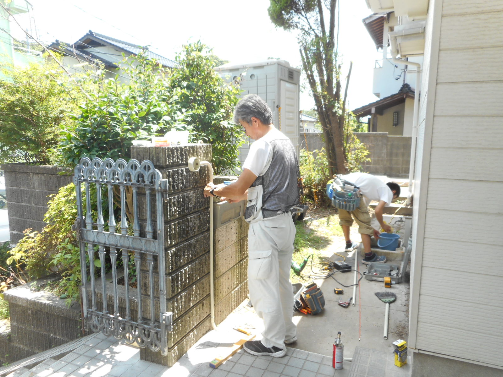テレビドアホンの、配線工事をしています!! 門柱の正面に、ドアホンの玄関子機を取付けます!!