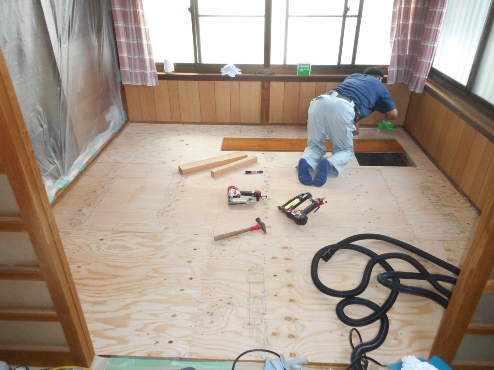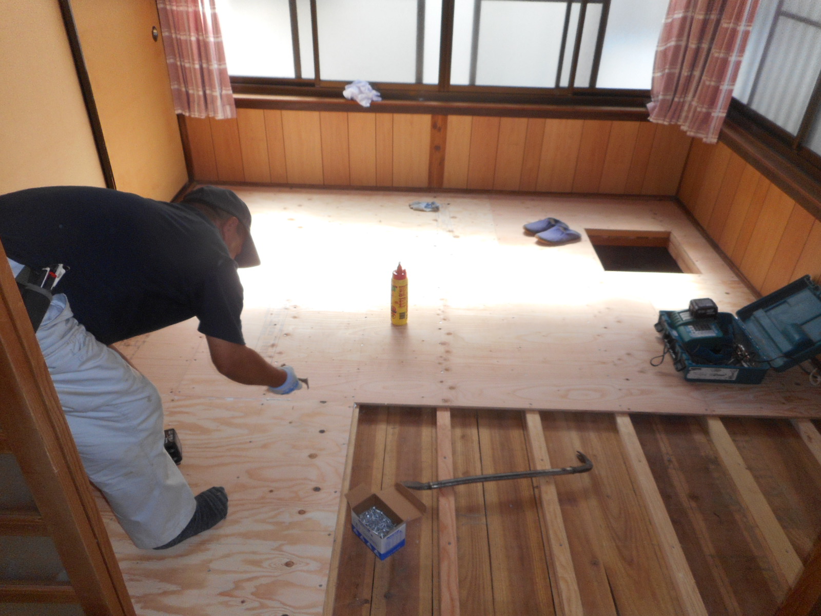 根太を施工し、捨て張りコンパネを施工します!!