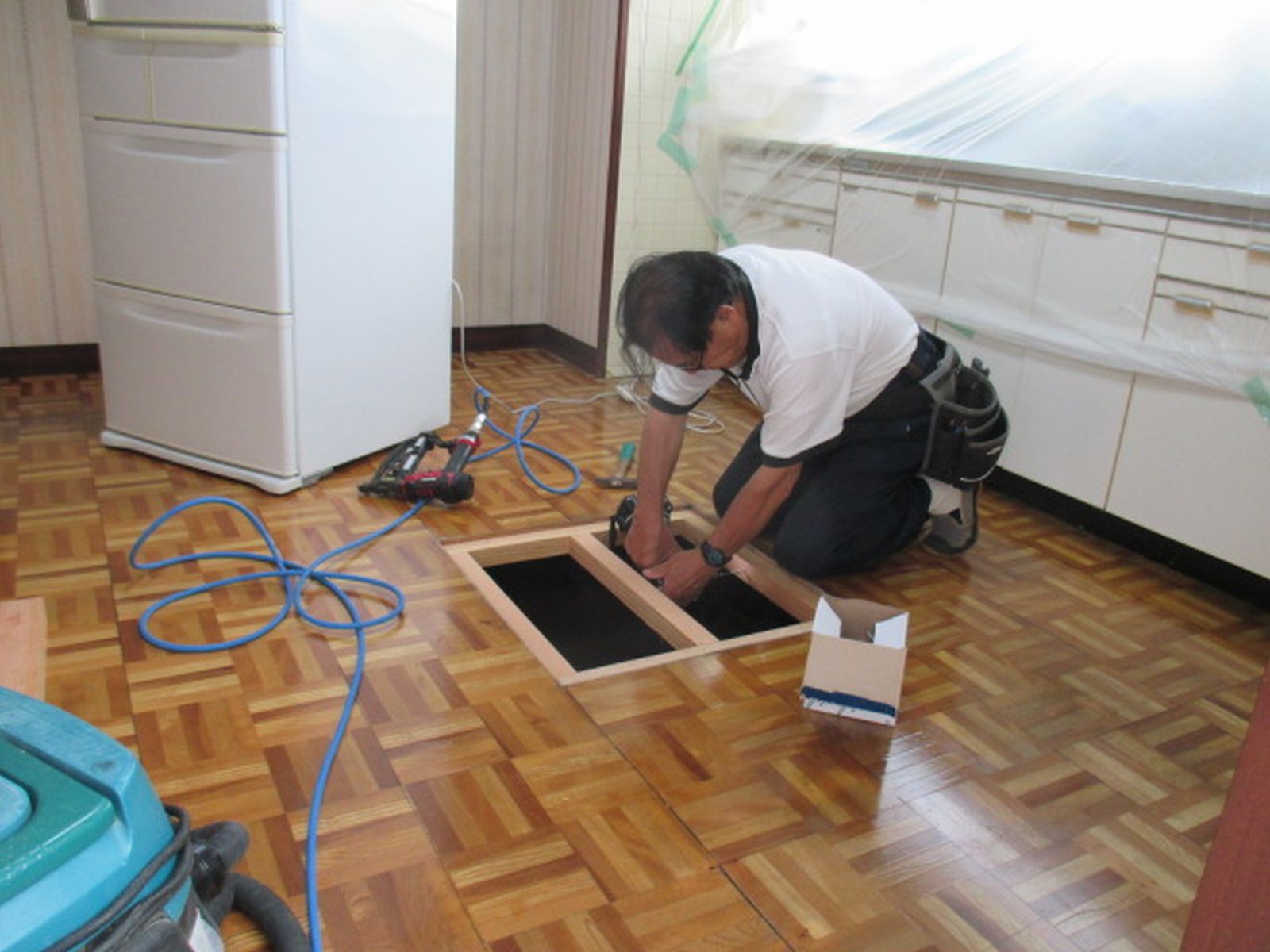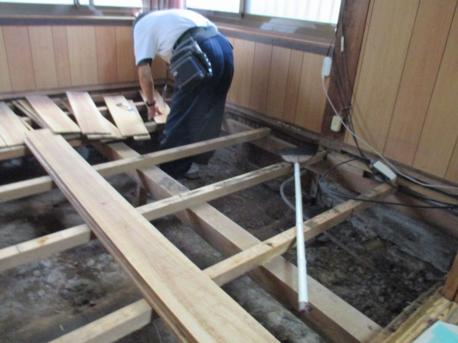 こちらのお宅は、台所と玄関から廊下廻りの床がブカブカすると言うことで、既存上部より
