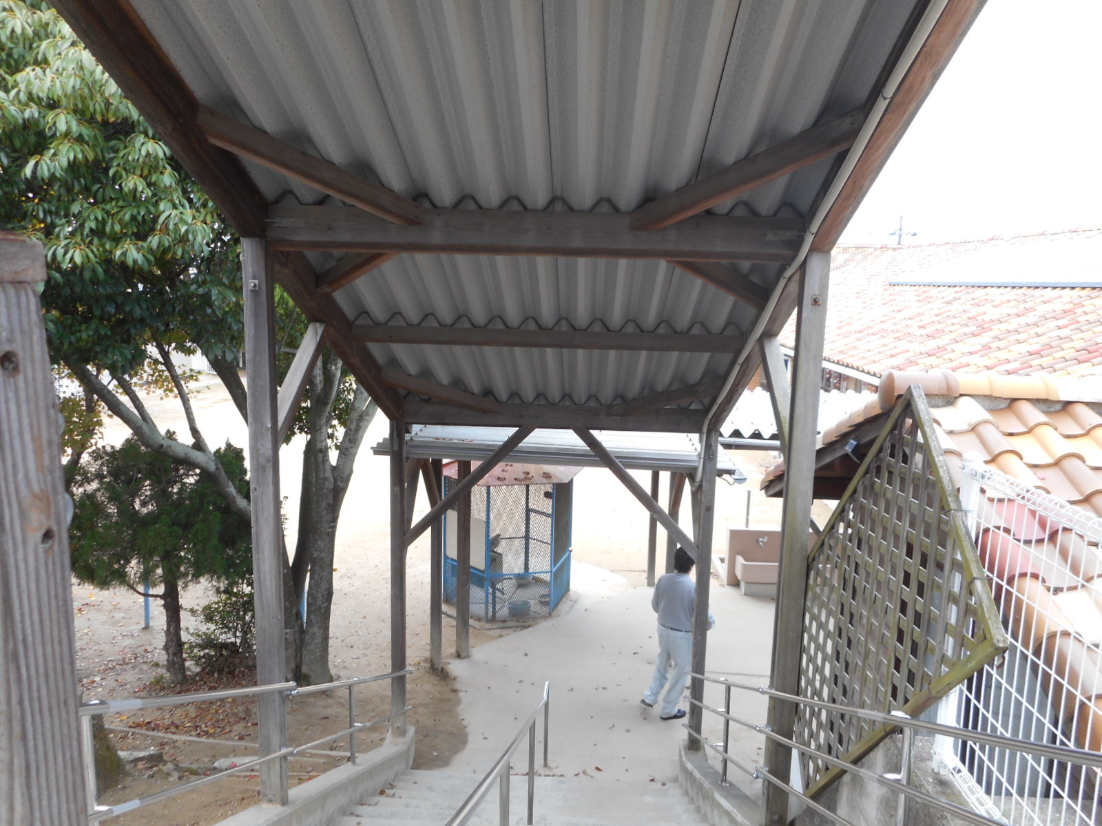 | 渡り廊下に、塗装前の養生をしています!! | 階段下も、順次塗装します!! |