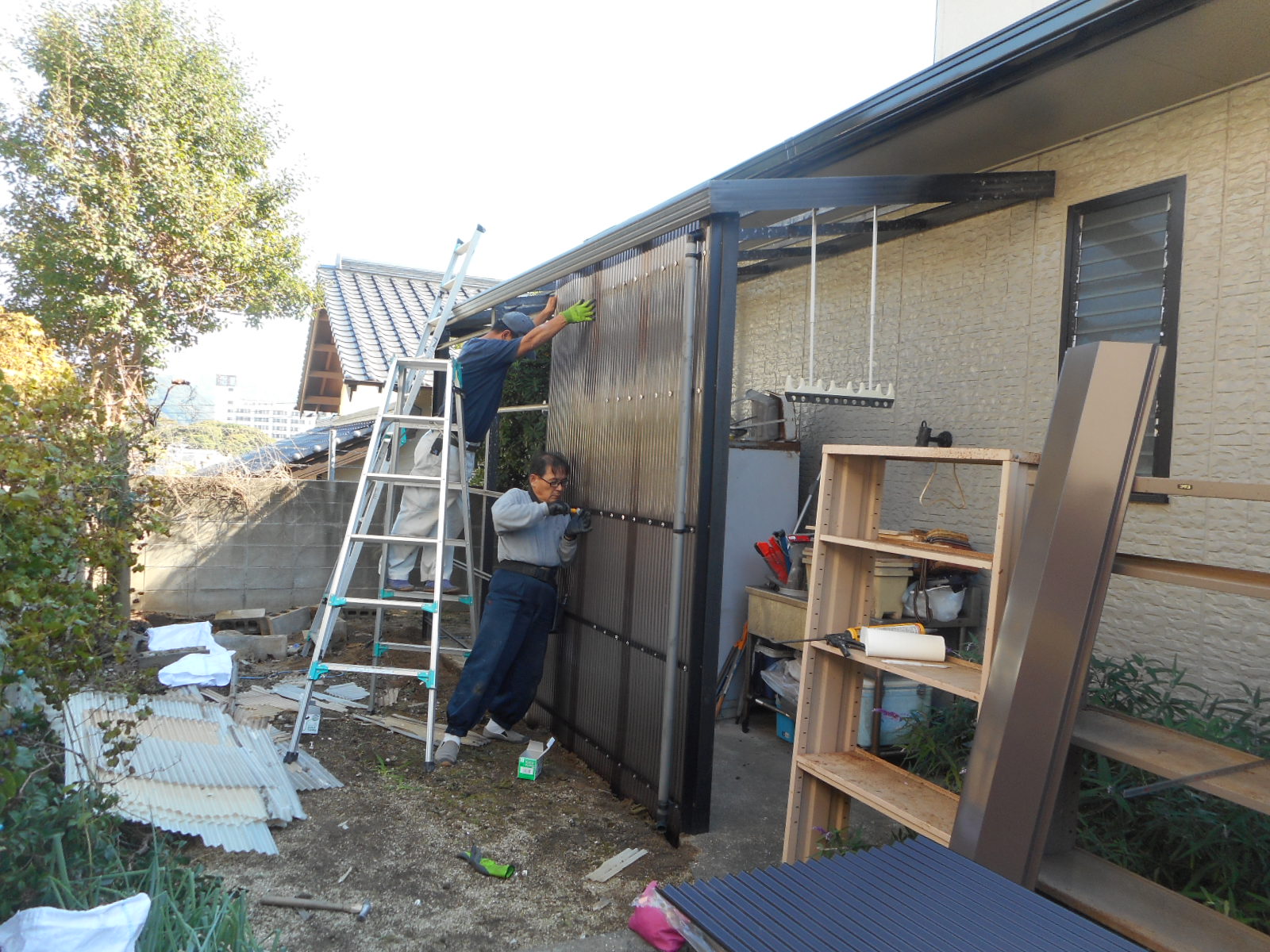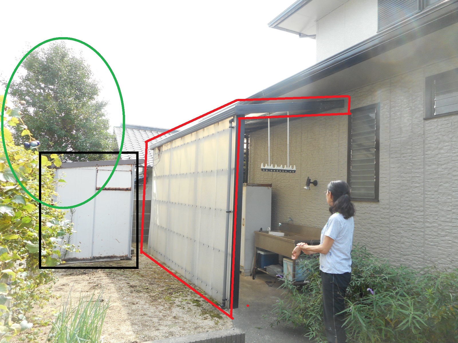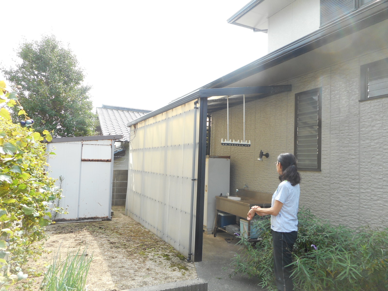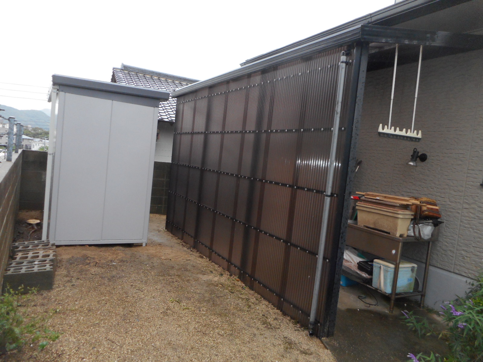 4年前に浴室の改修工事をやらせて頂いた山の田西町の方から、この度テラスの波板の張替え、物置の交換、不要な木の伐採の依頼がありました。