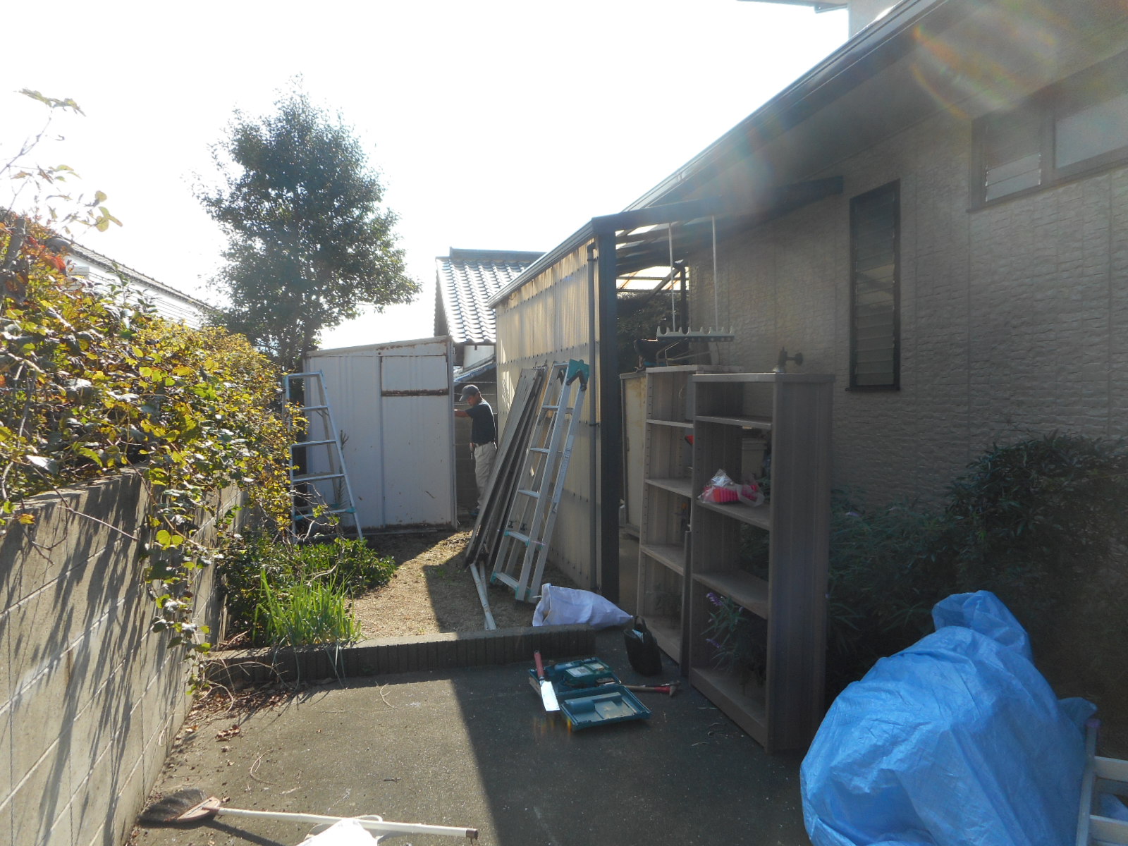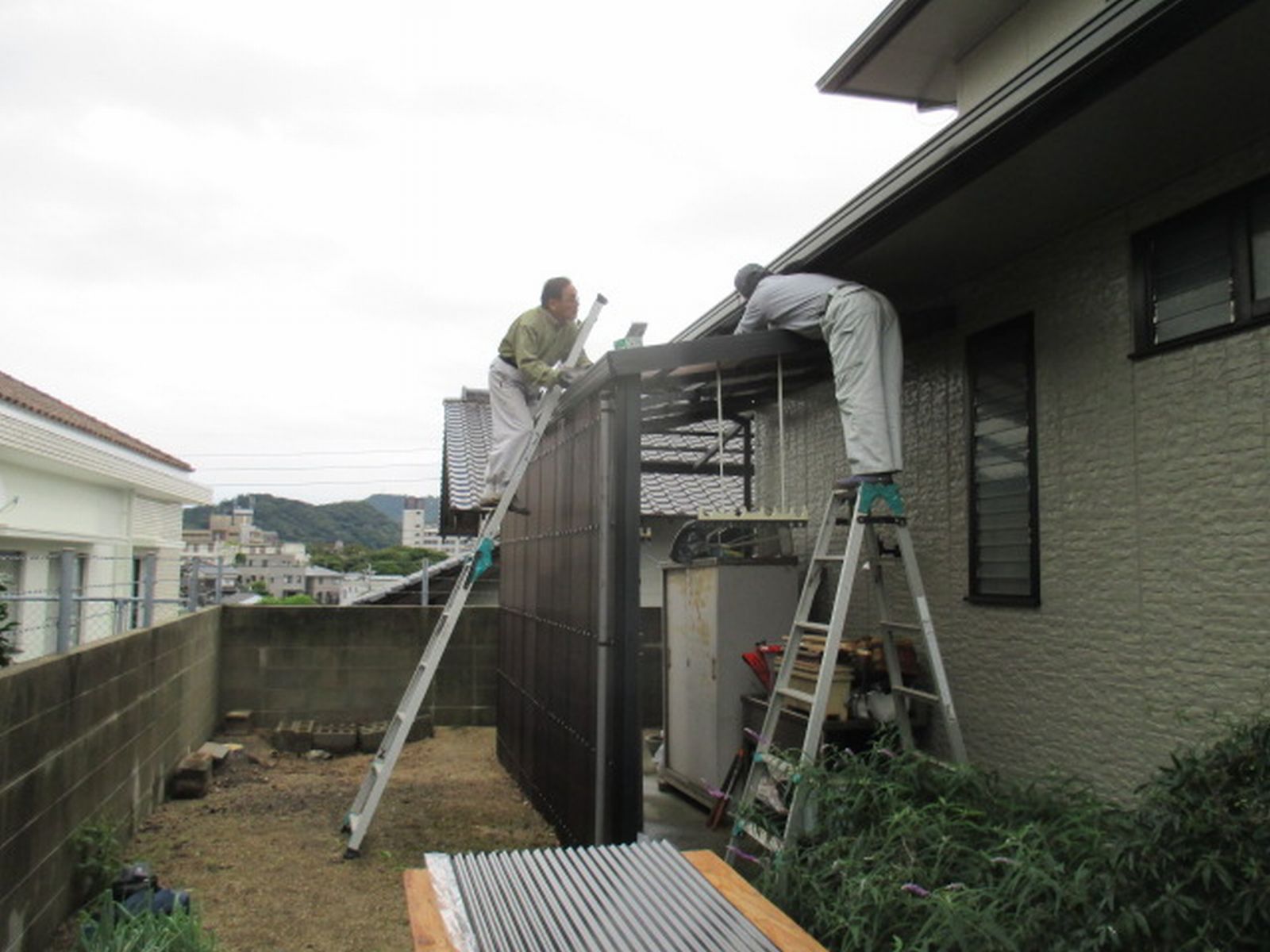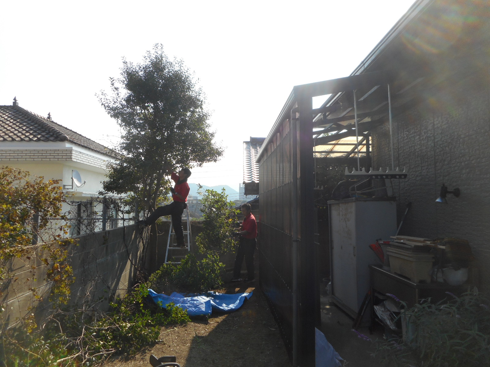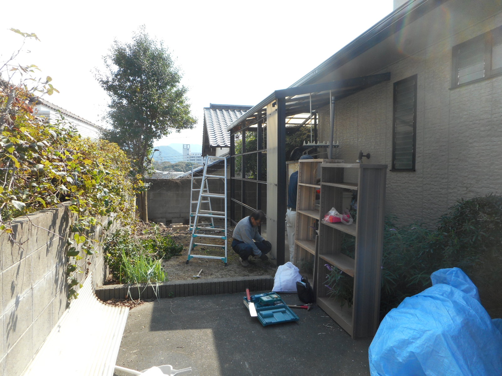 4年前に浴室の改修工事をやらせて頂いた山の田西町の方から、この度テラスの波板の張替え、物置の交換、不要な木の伐採の依頼がありました。