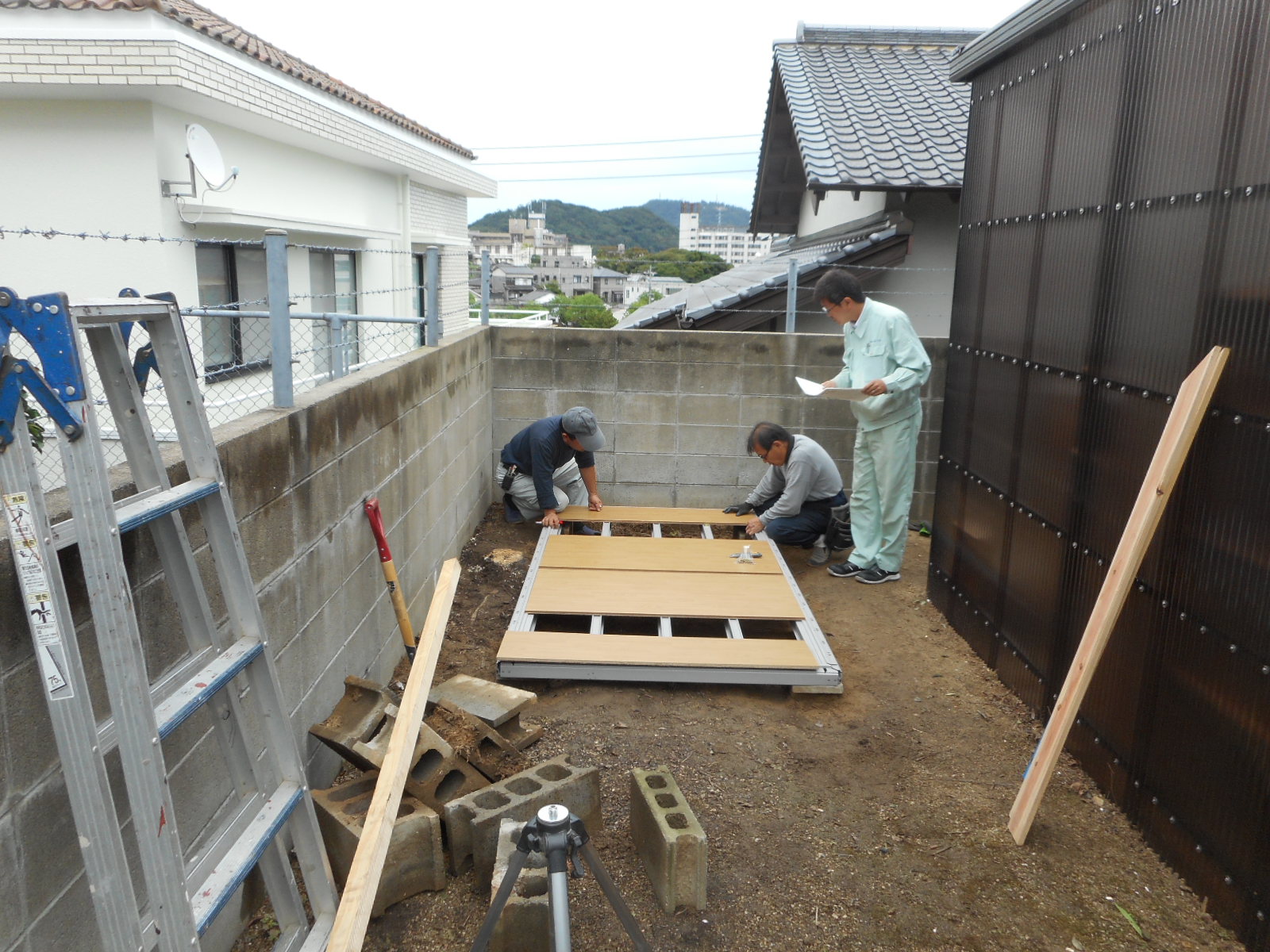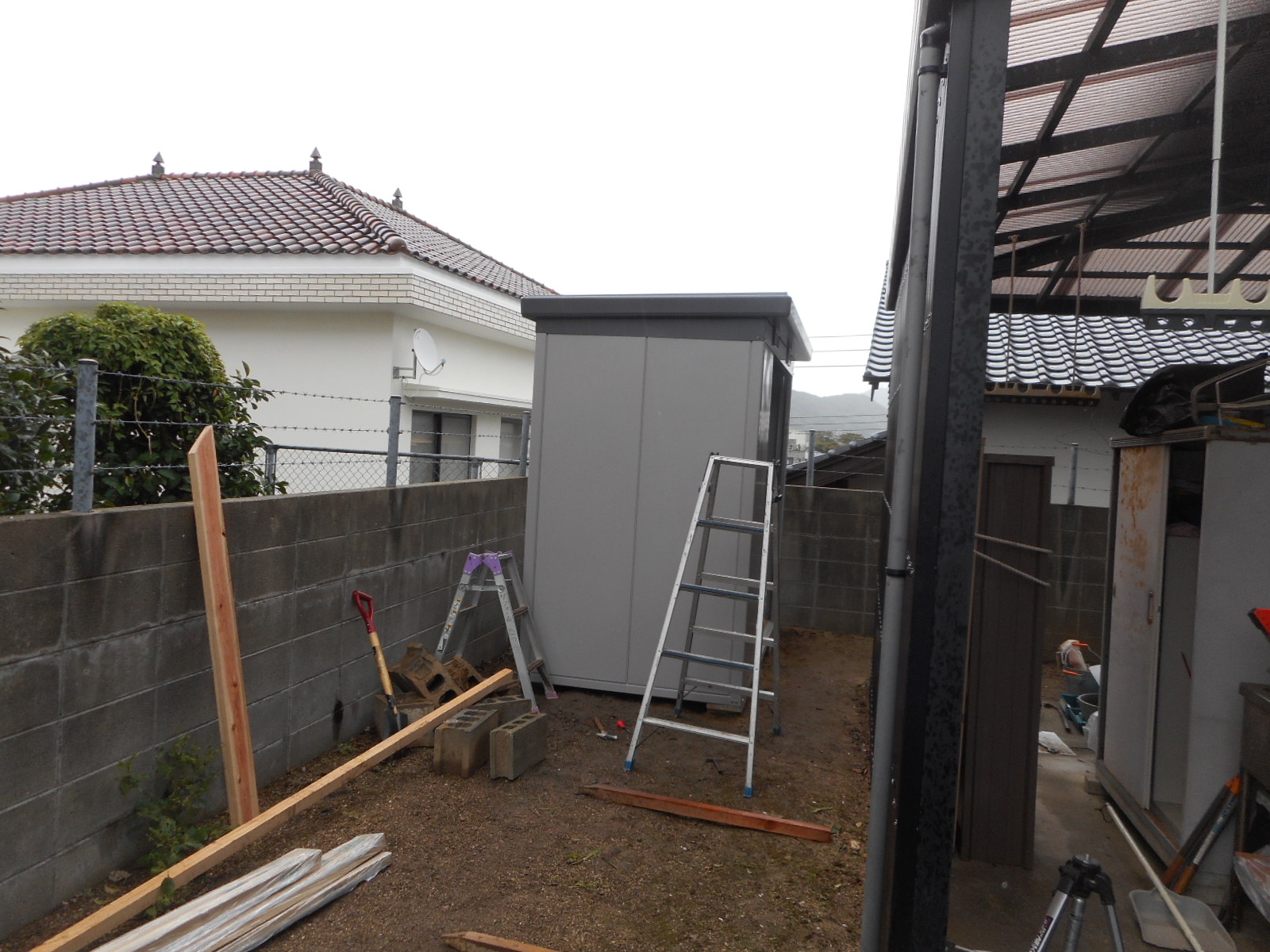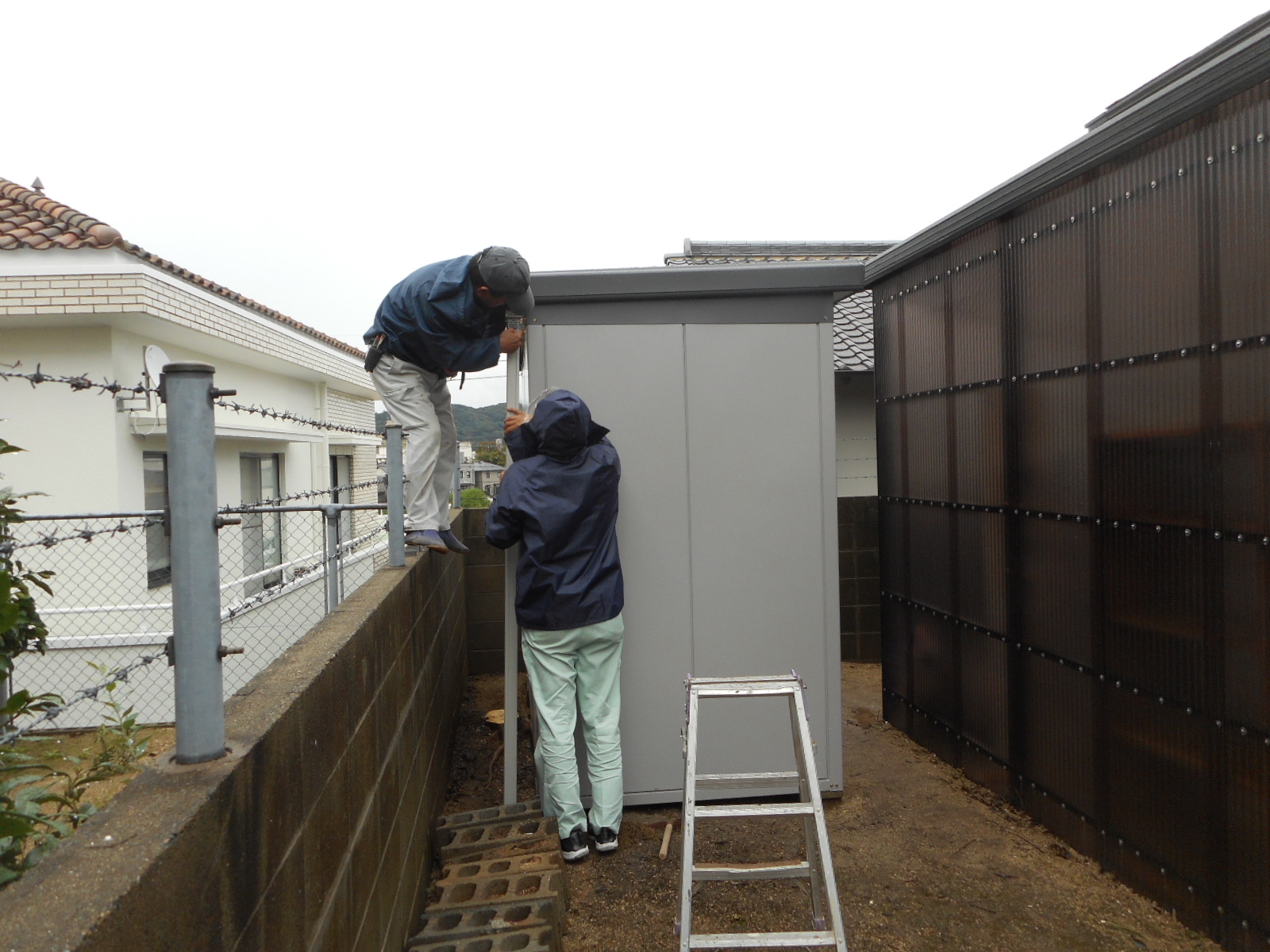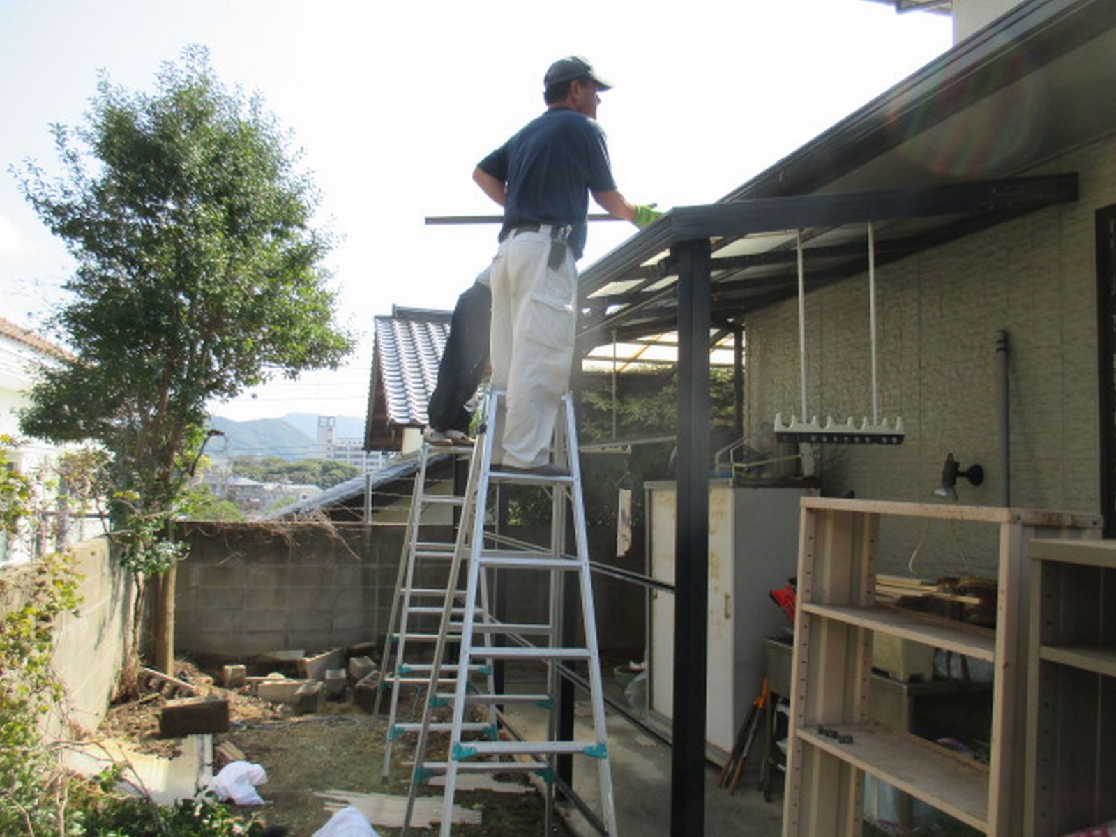 4年前に浴室の改修工事をやらせて頂いた山の田西町の方から、この度テラスの波板の張替え、物置の交換、不要な木の伐採の依頼がありました。