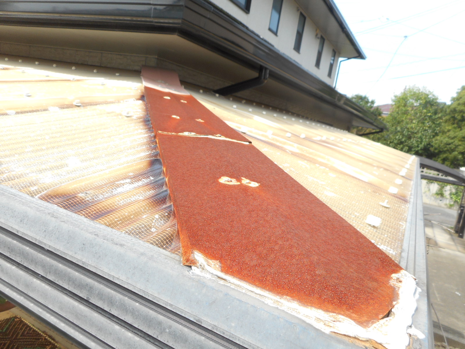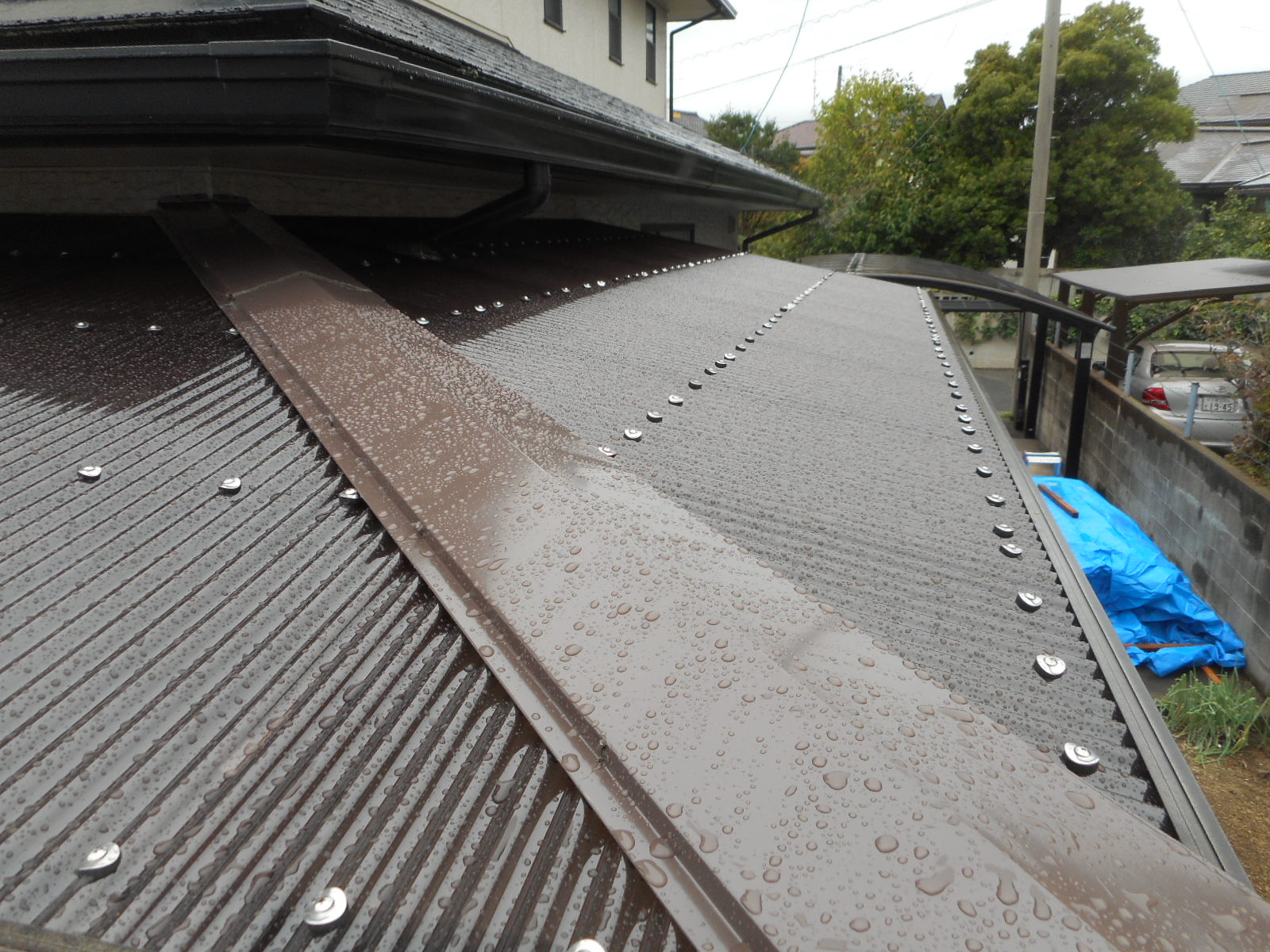 テラスの屋根に新規の波板張りと、コーナー部分に棟板金を施工します。