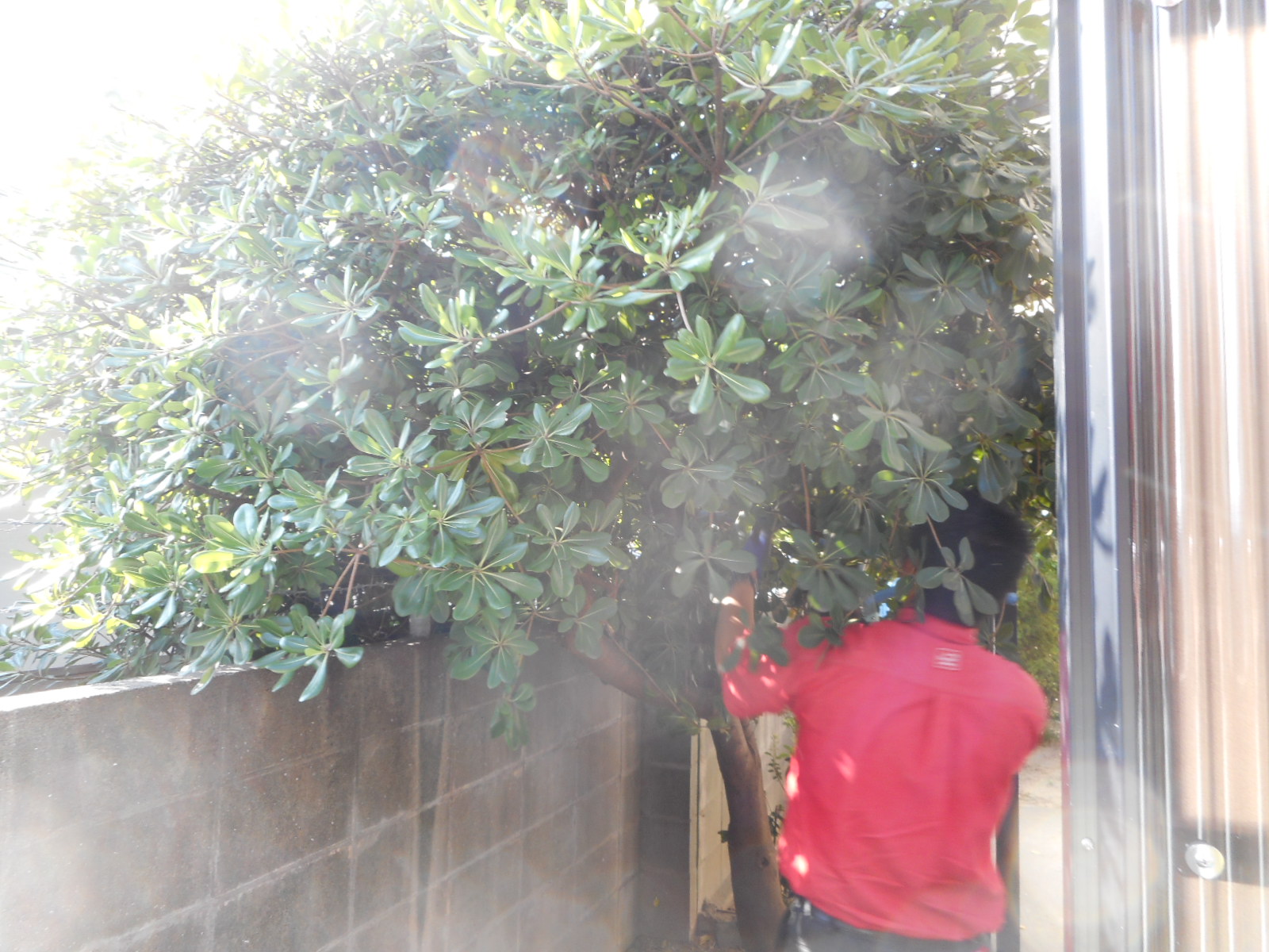 新規の物置を設置するのに、邪魔になるの木と、東側にある木の伐採をします。