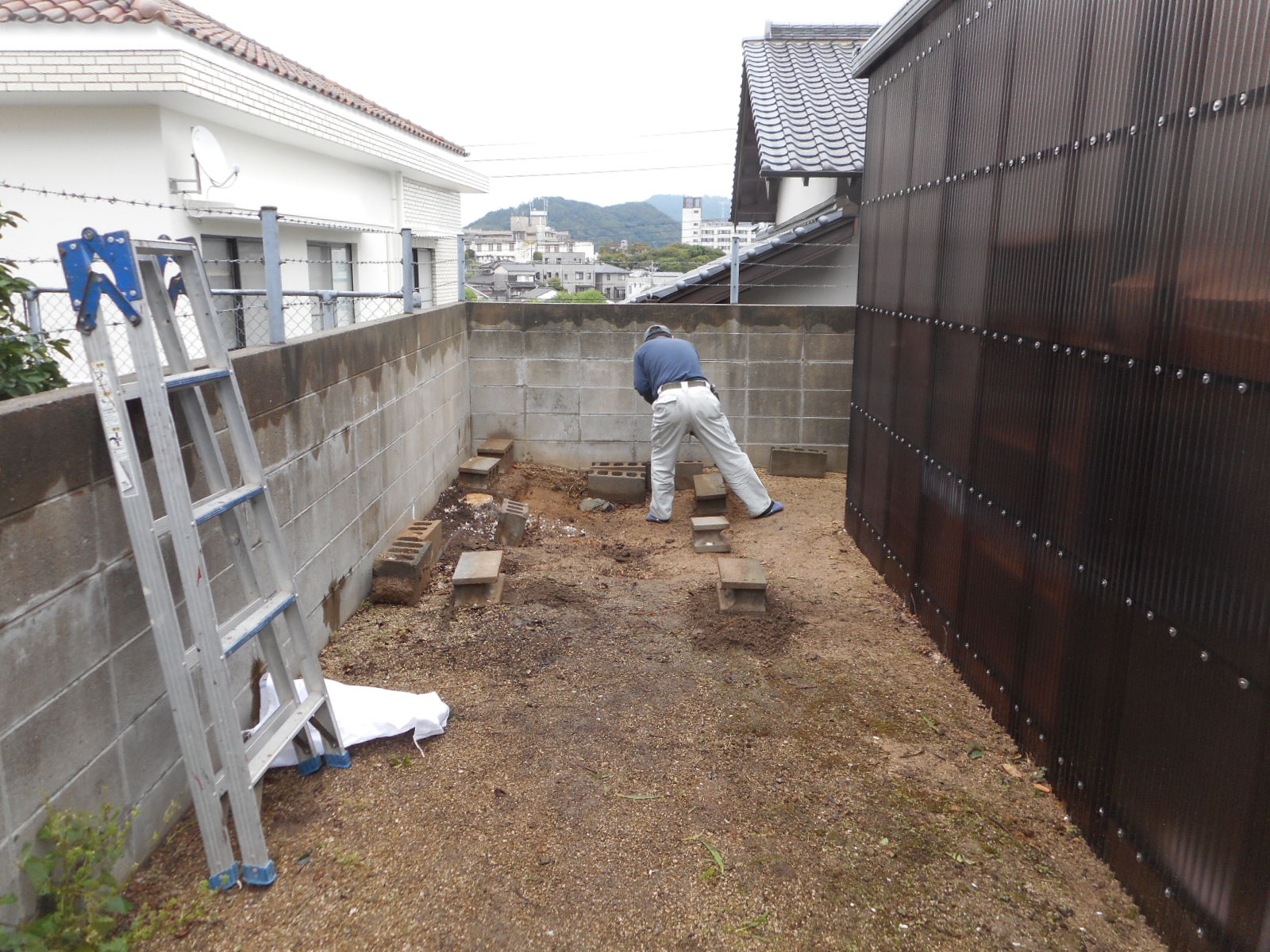 整地し、基礎ブロックを設置します!! 基礎ブロックの上に土台を組み、床の部材を組付けます!!