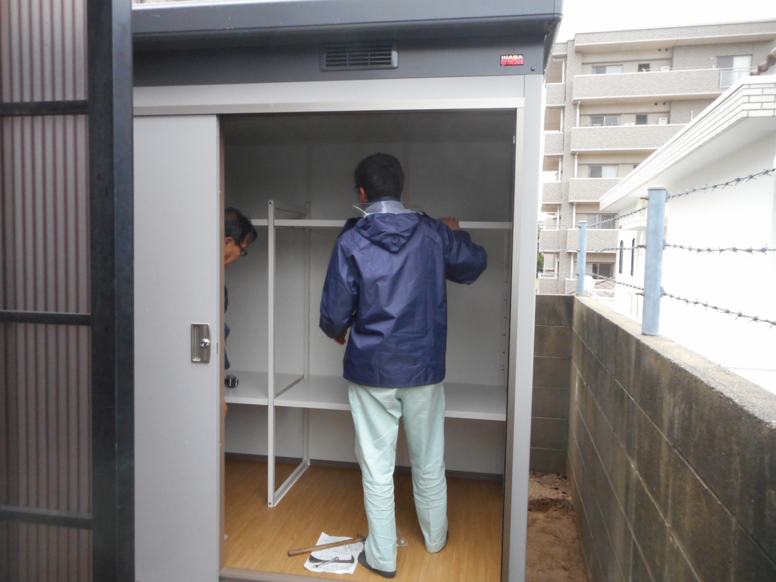 この物置は、高級な断熱構造物置なので内部には断熱構造のパネルを組付けます!! 入り口に、3枚引き戸を組付けます!!