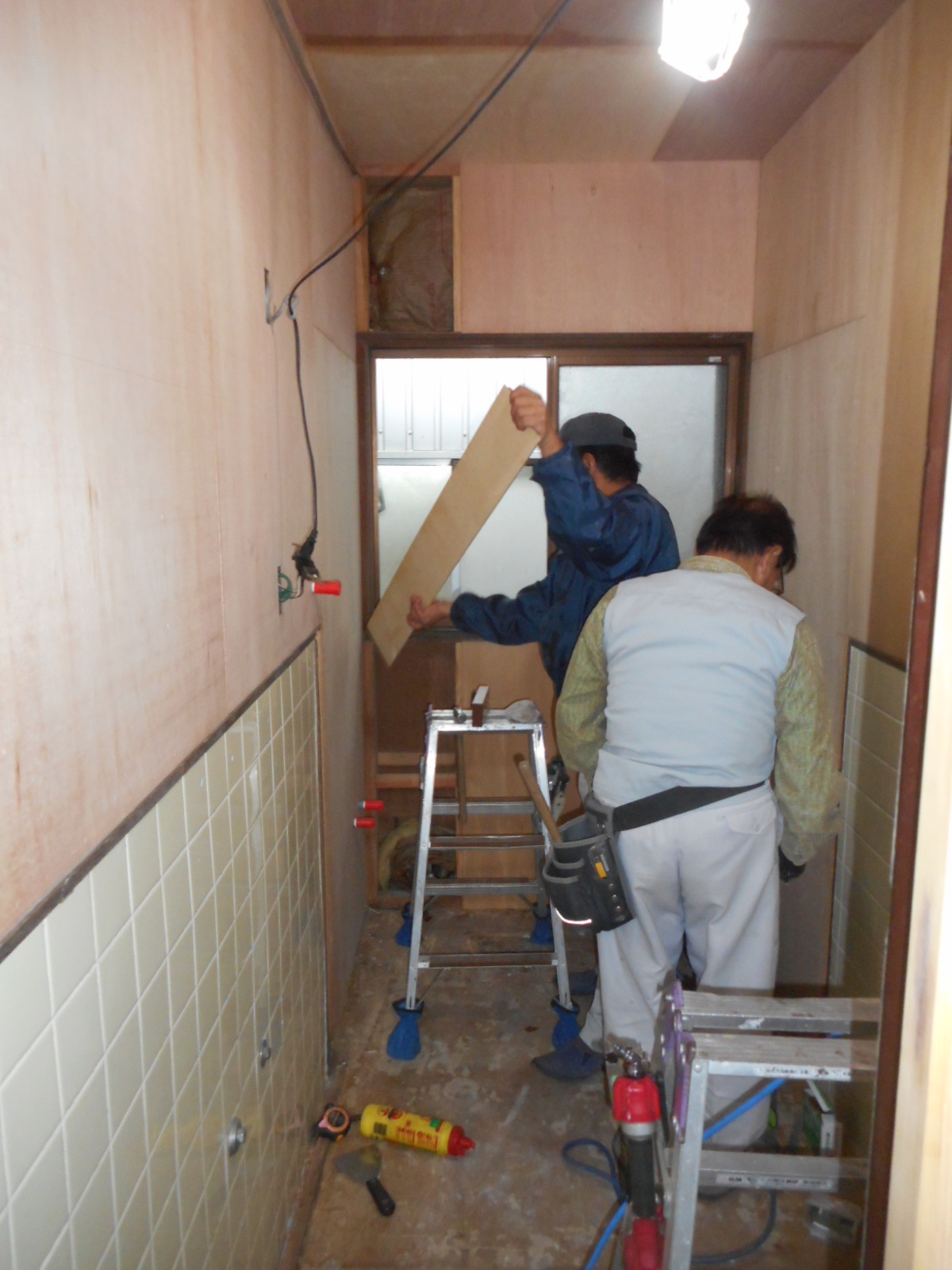 | 化粧台と洗濯機を一旦撤去し、天井と壁の解体をします!! | 解体後下地整備をし、天井と壁にベニヤを施工します!! |