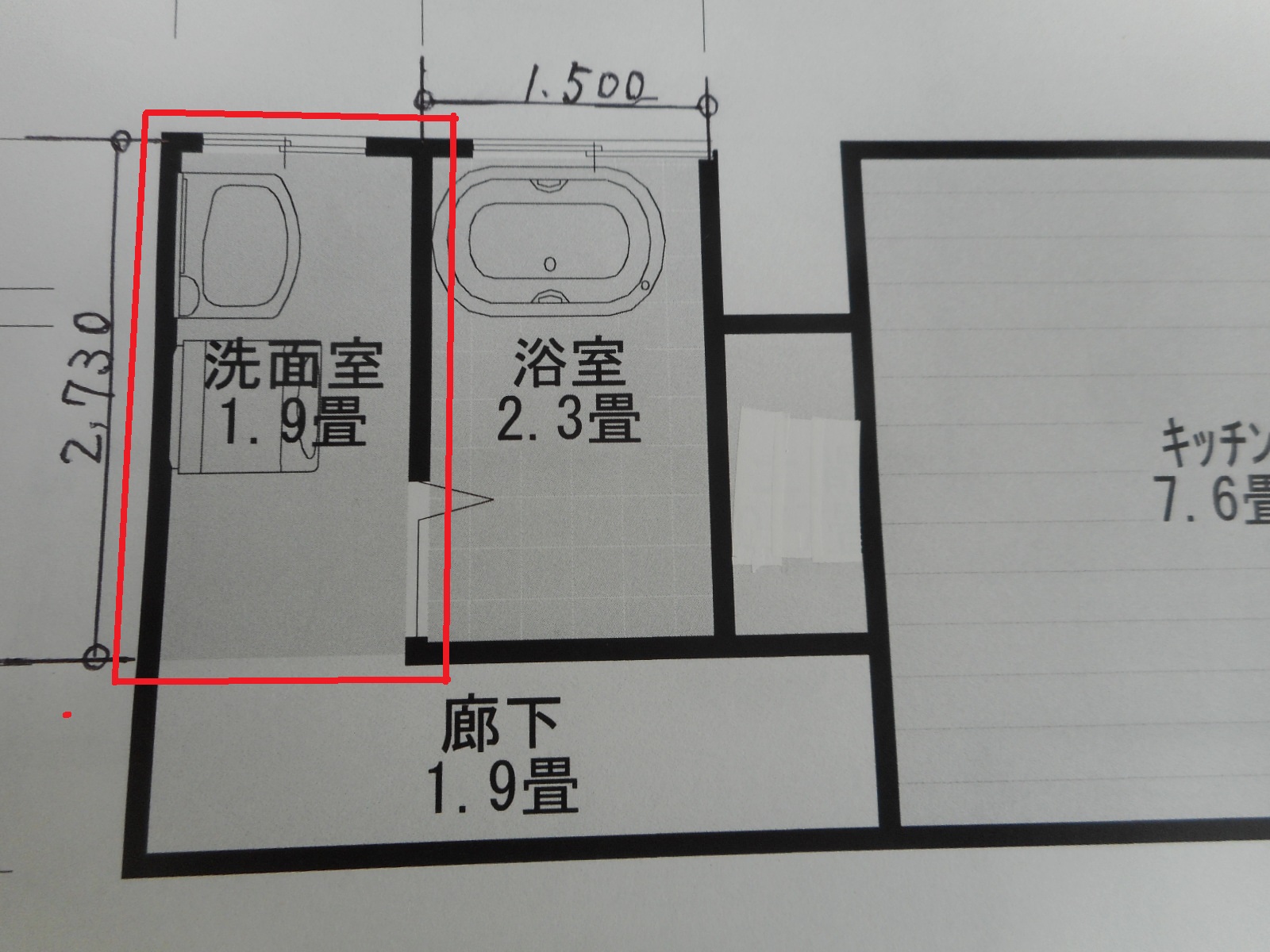 ・既存の化粧台と洗濯機は一旦撤去し、改修後再設置します。
