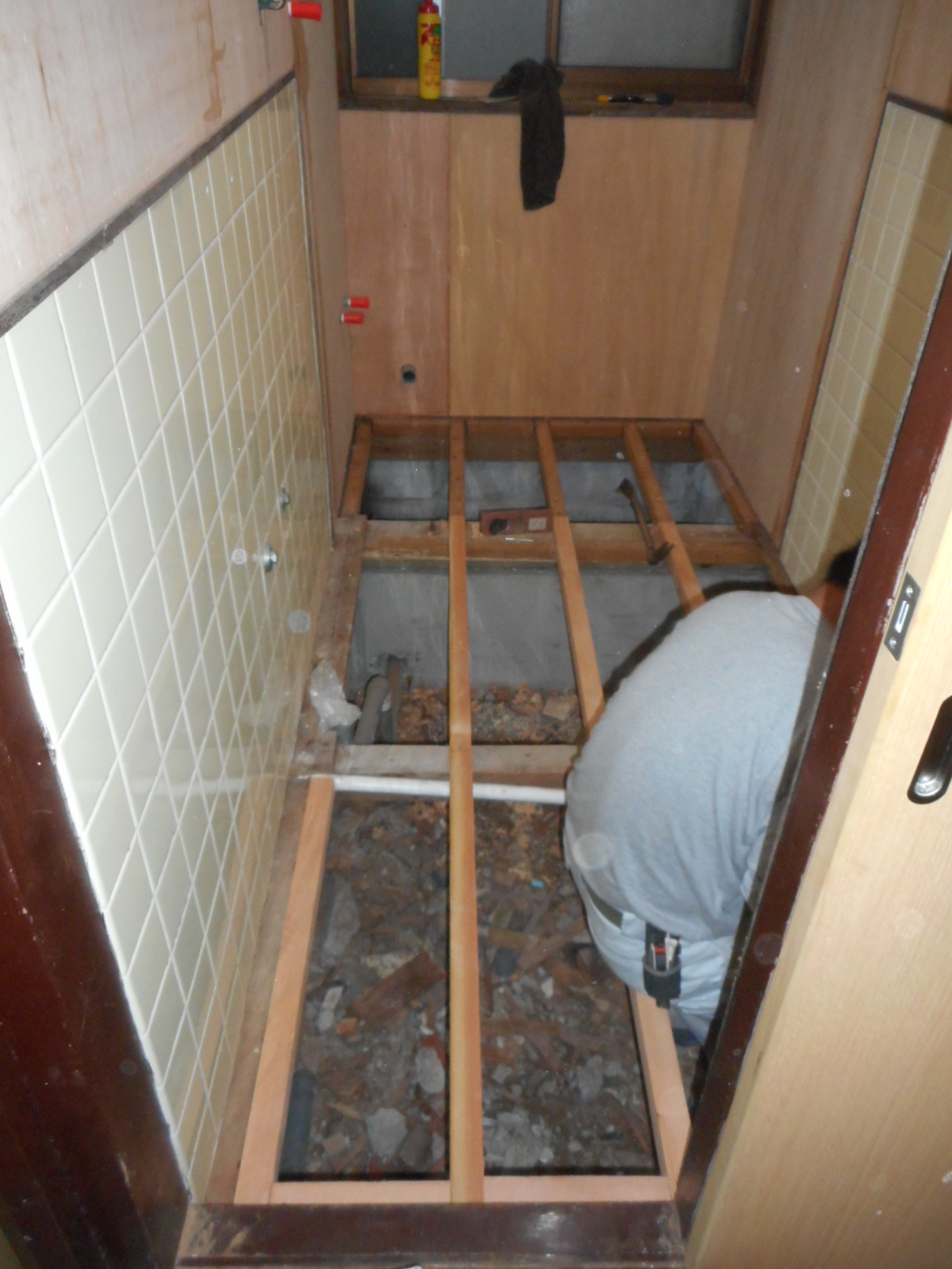 ・床はブカブカすると言うことで、全面解体し根太を補強、防水合板を施工しCF仕上げにします。