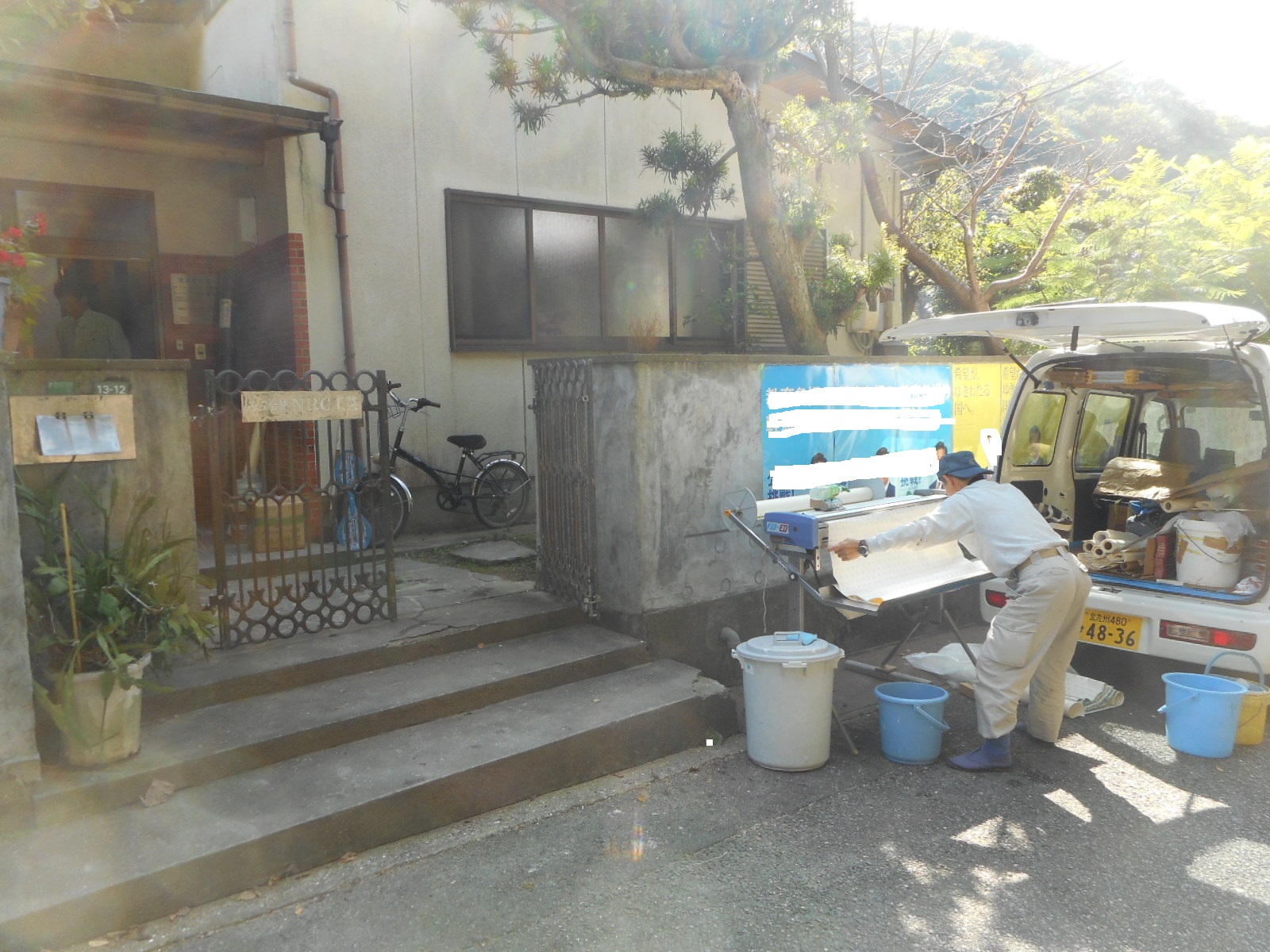 クロス屋さんが、クロスを張る準備を外でしています!!