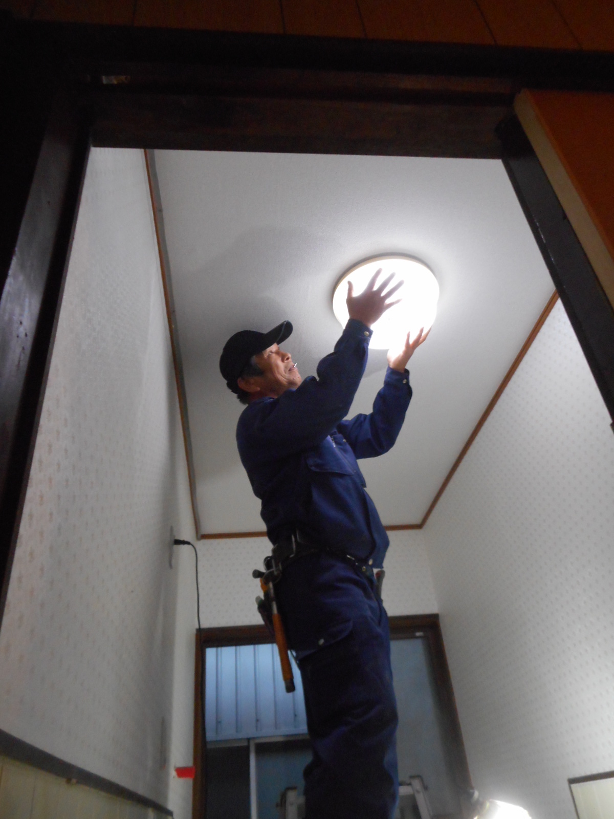 | クロス張りが終わったら、照明器具を取付けます!! | 床にCFを張り、電気屋さんがコンセントを交換します!! |