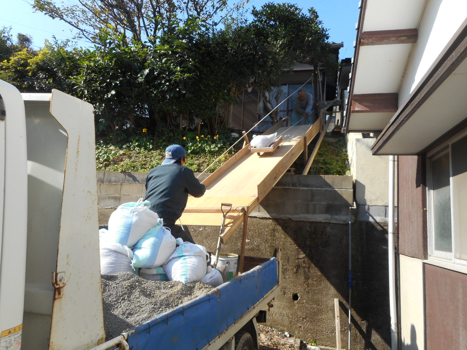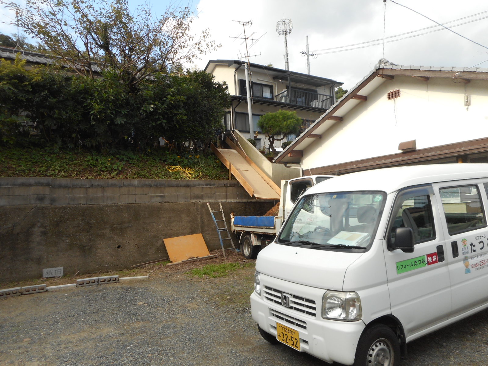 この経路での廃材の運び出しや、材料の搬入は大変なので、下の駐車場を借りてこれらの作業を