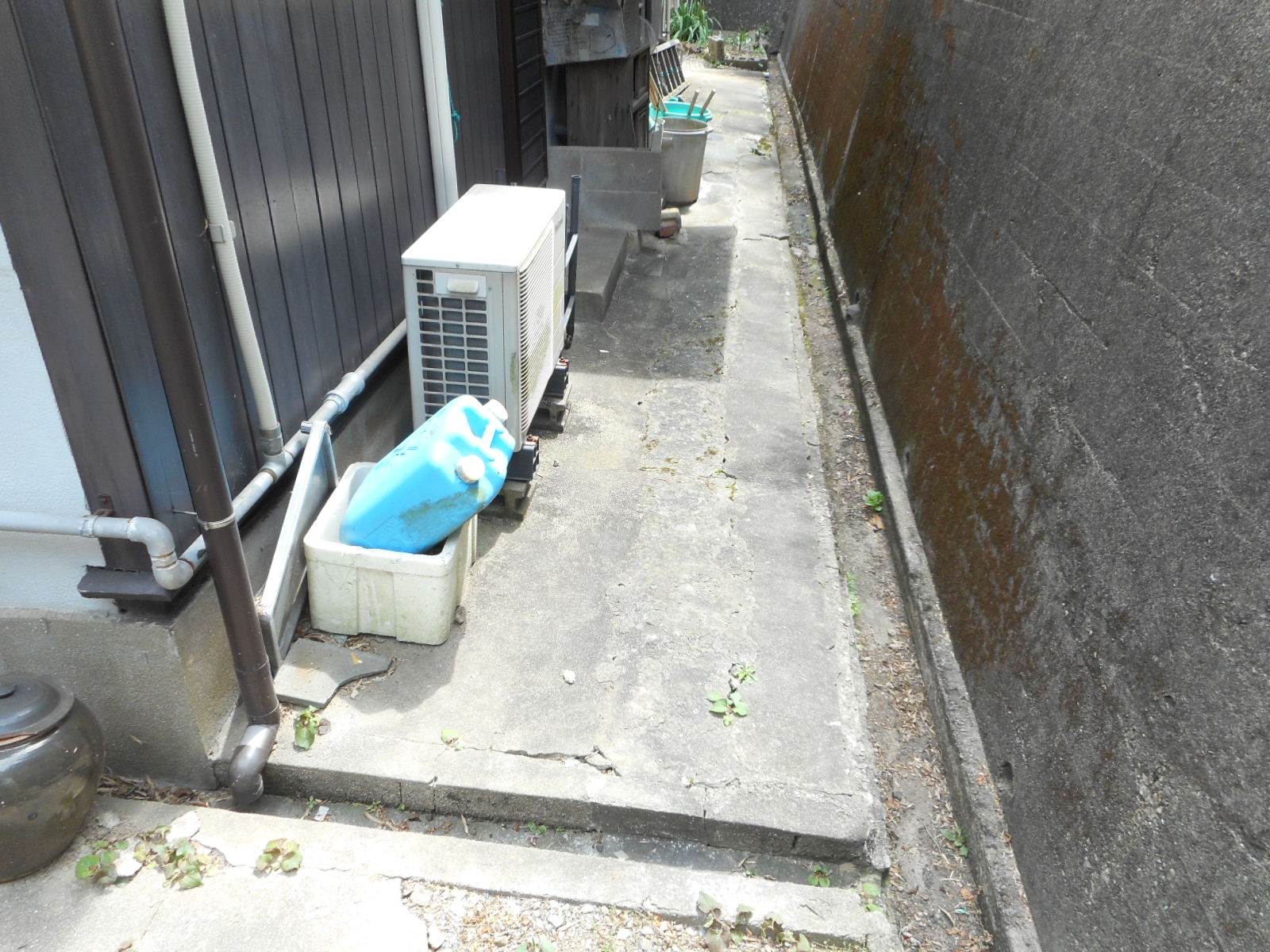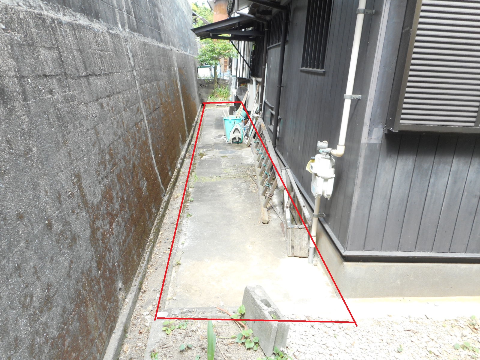 赤線()で囲った部分のコンクリートや、この中にある2箇所の枡の状態が悪いのでコンクリート部分は全面解体し、新規のコンクリートを打ち、枡も交換し配管の整備もします。