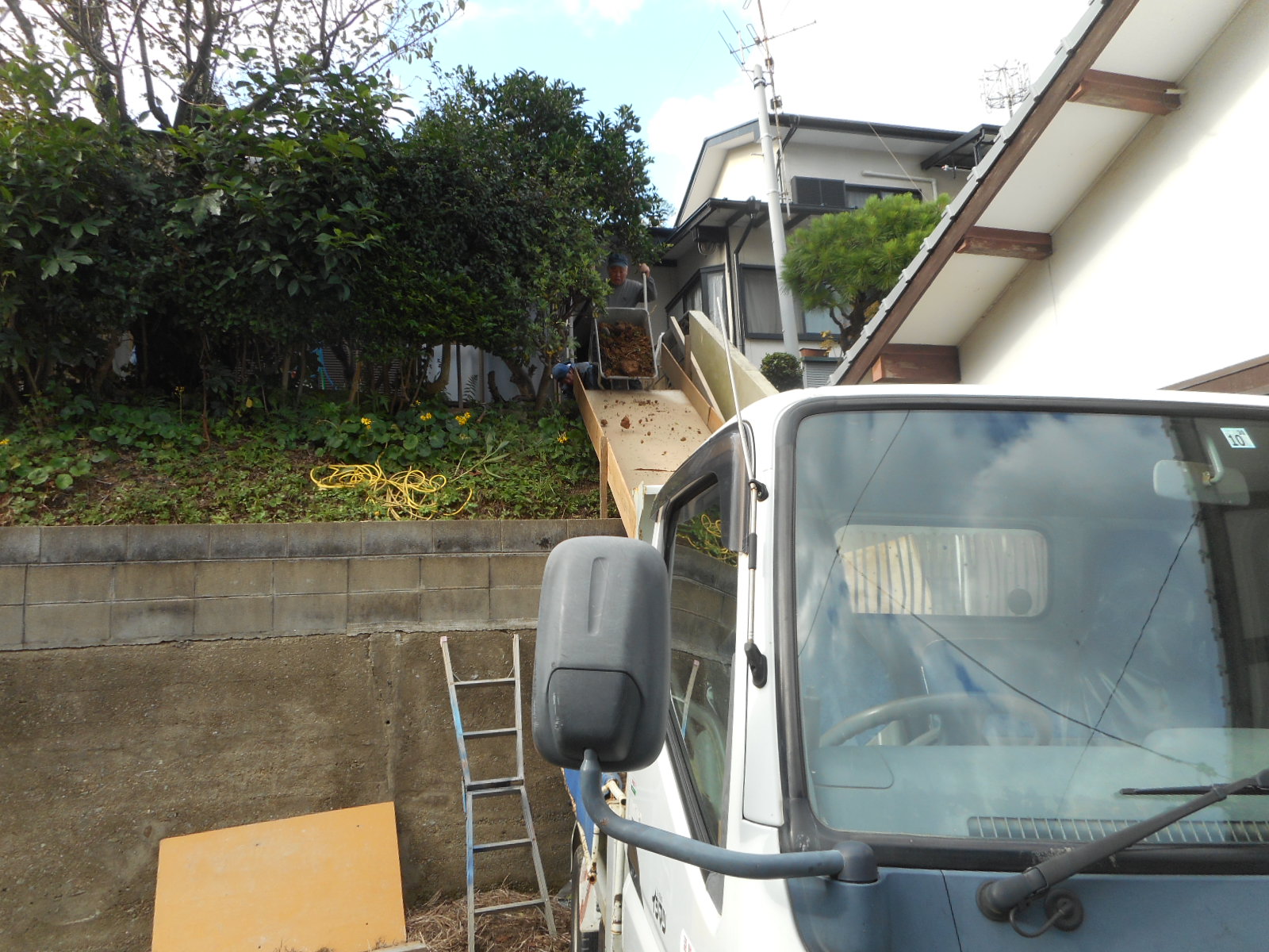 駐車場の隅に、ご覧の様な滑り台を造りました!! スキ取った土砂を上から滑り台に落とし、下のダンプに積込んでいます!!