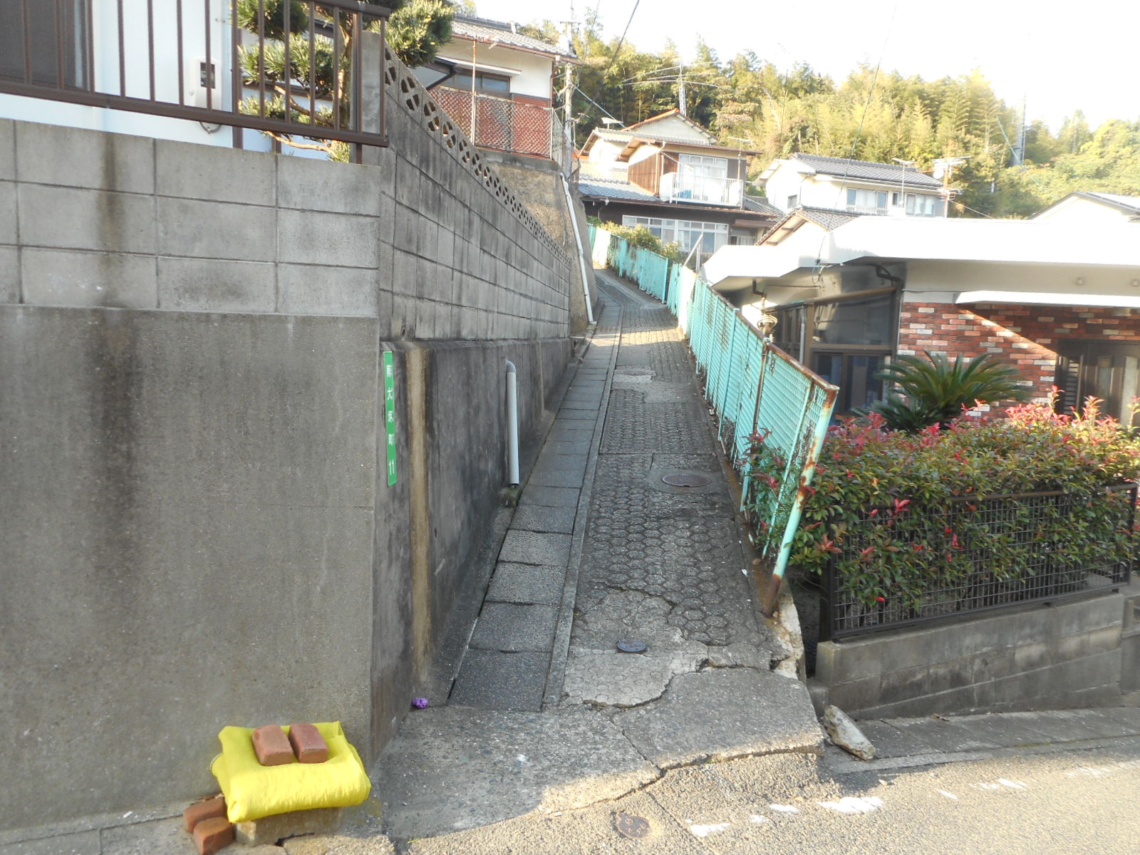 表の道路から、狭い道を30m位登り坂を上がります!! 屋敷に入るのに、階段を降りて行きます!!