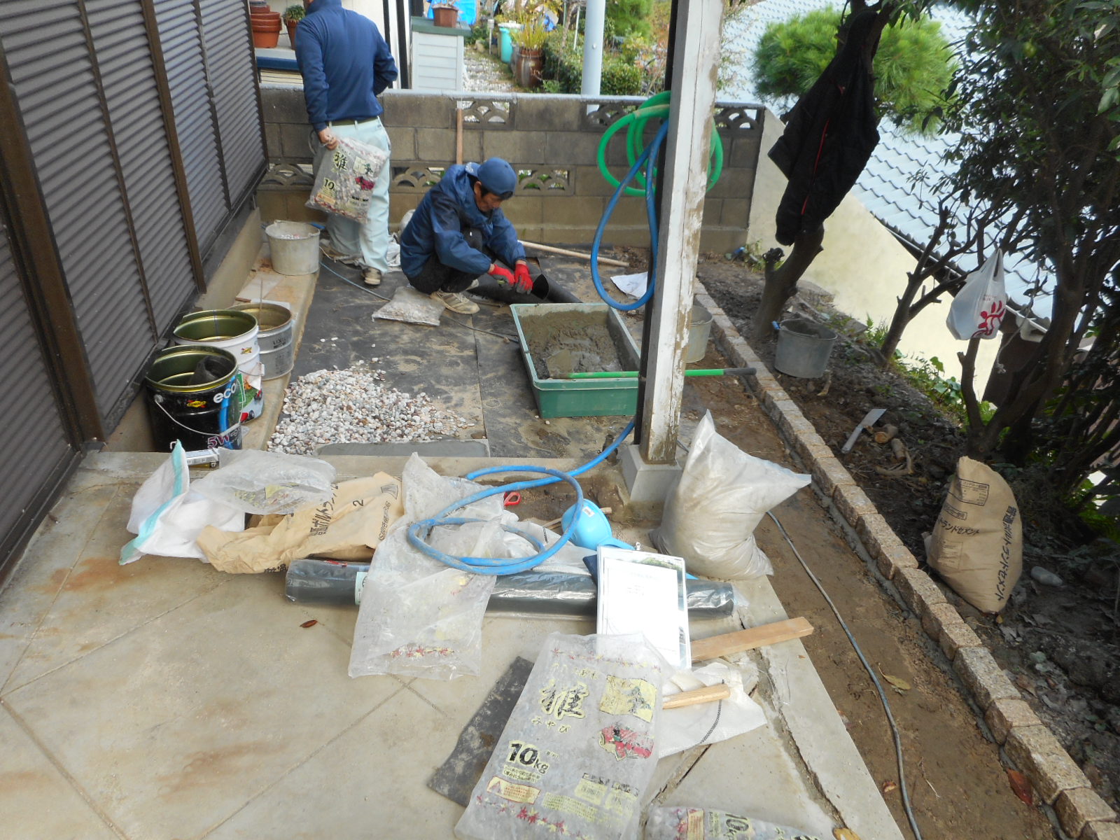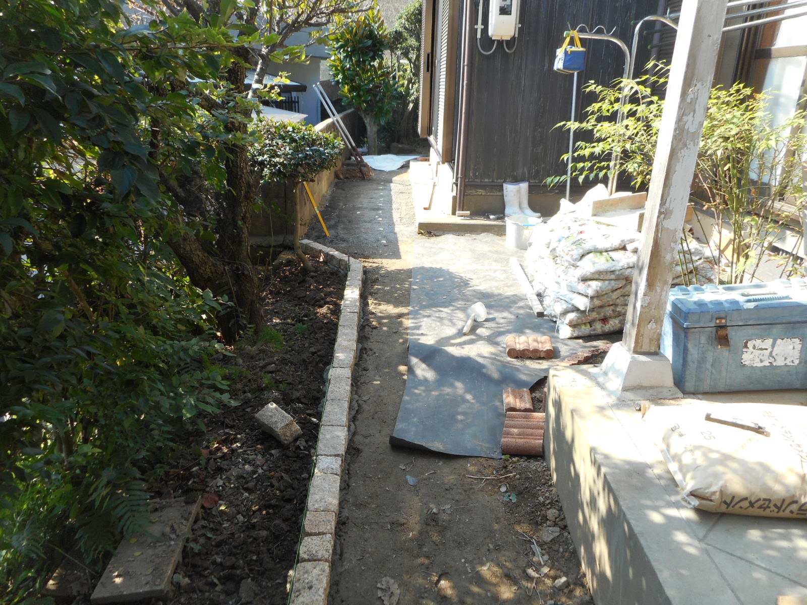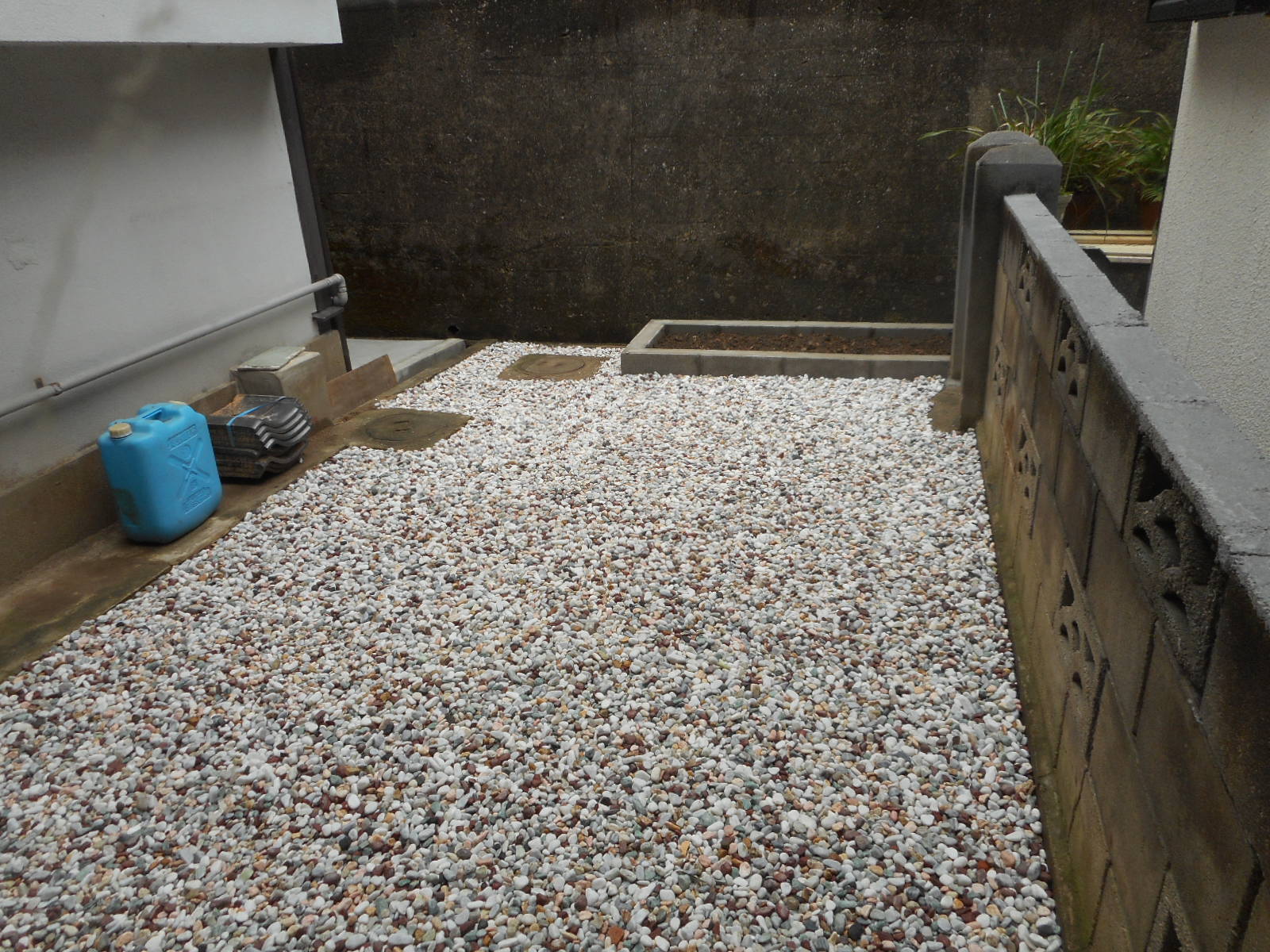 | 庭の中の土の部分を整地後、防草シートを施工し その上の玉砂利を敷いて行きます!! |