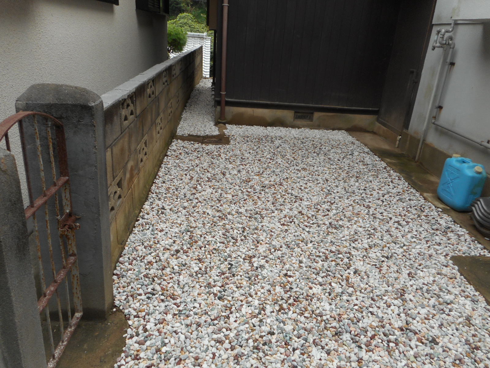 後は草の予防対策として防草シートを施工し、玉砂利を敷いて完成となります。