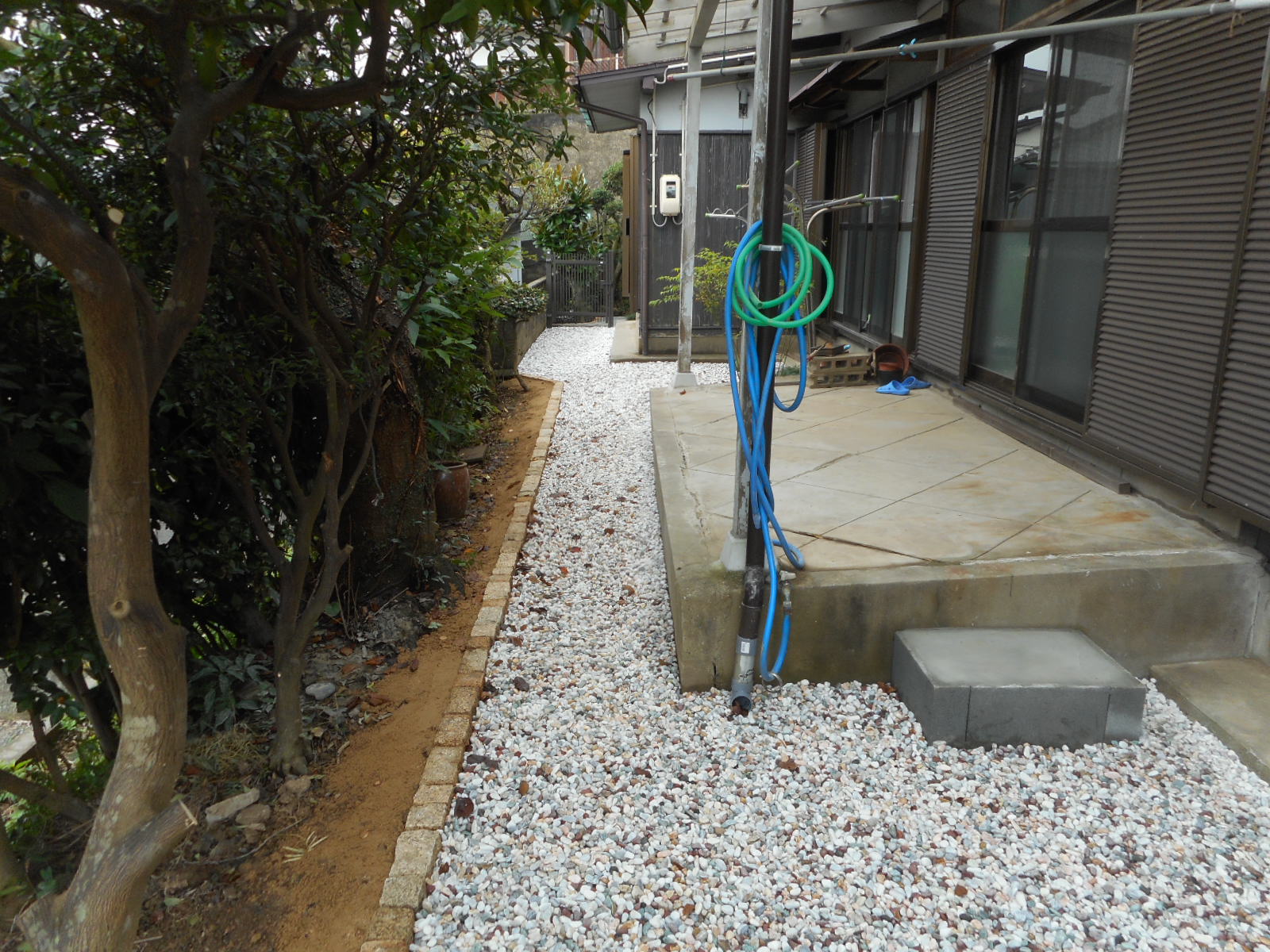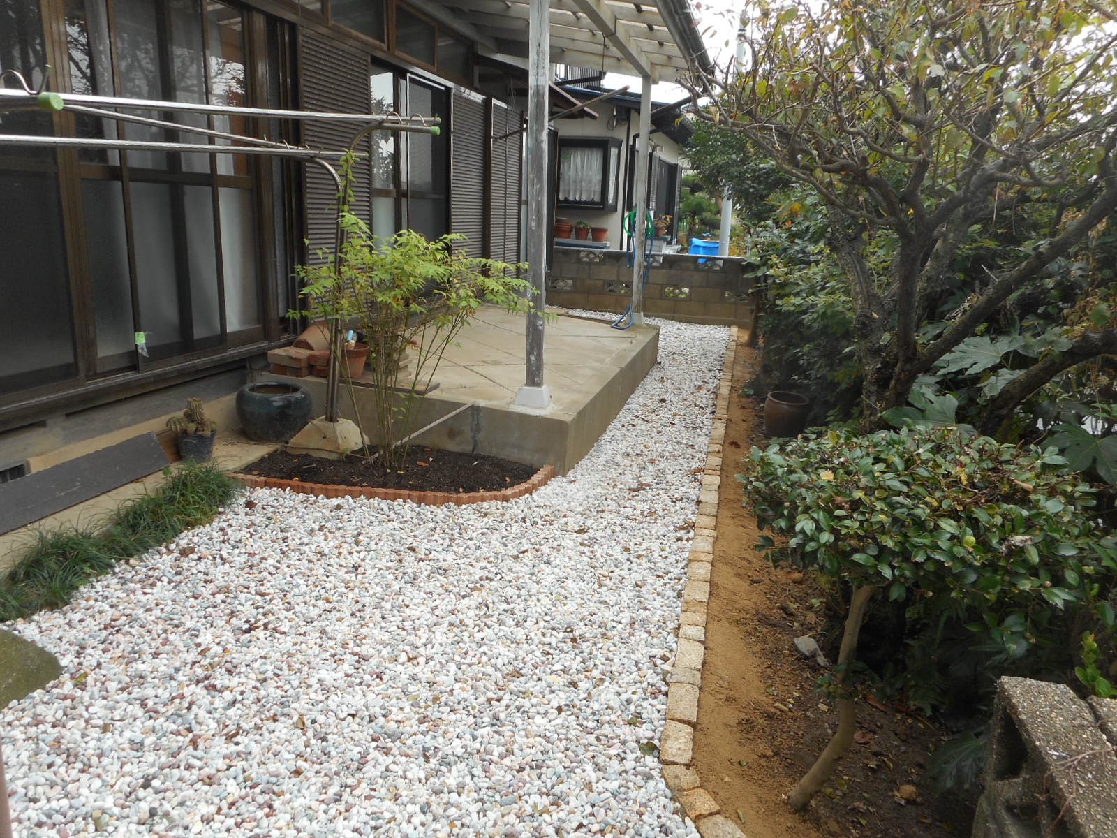 庭廻り全体を草の予防対策として、防草シートの施工から玉砂利敷きまで行い完成となりました。