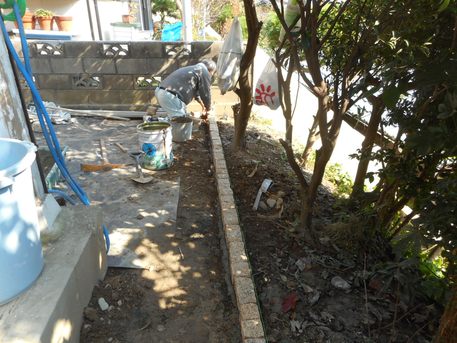 | 土手側に仕切りの、ピンコロ石を施工して行きます!! | ピンコロ石の施工が、完了しました!! |