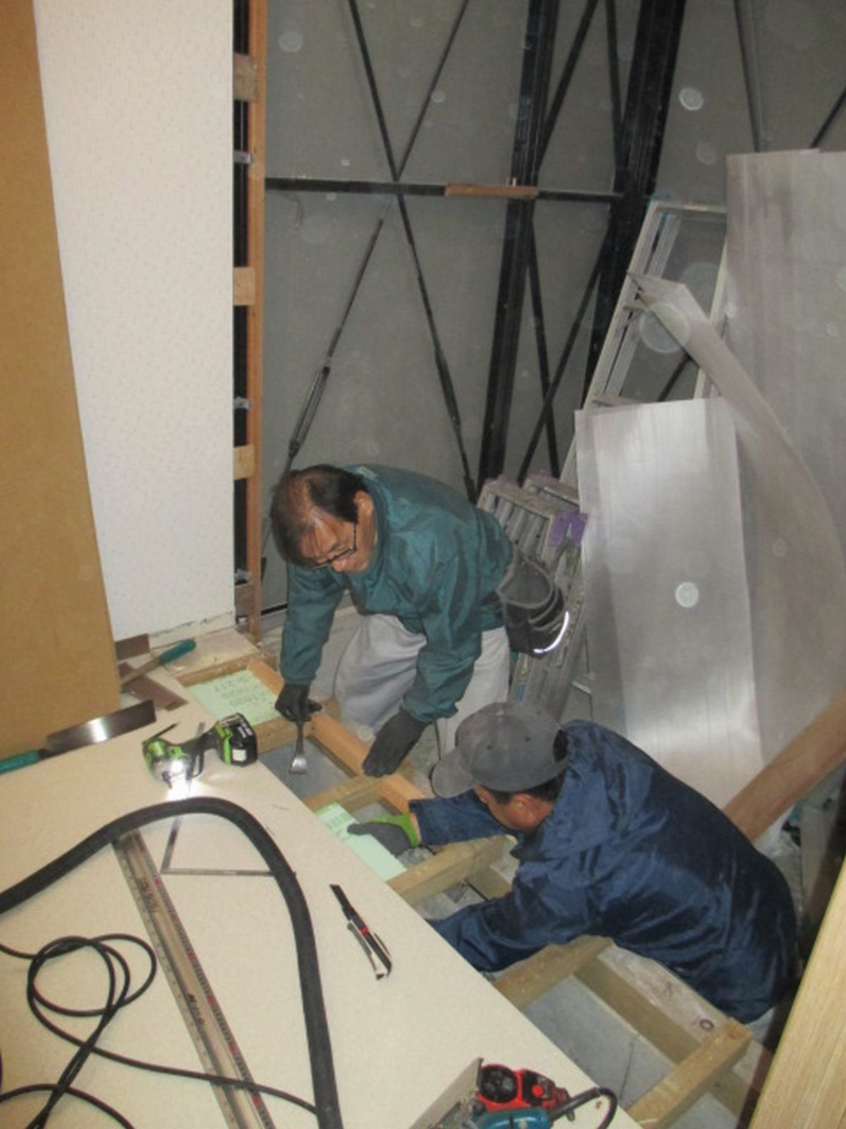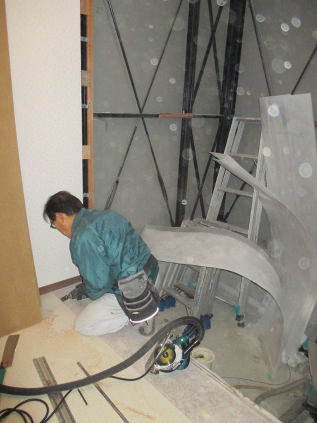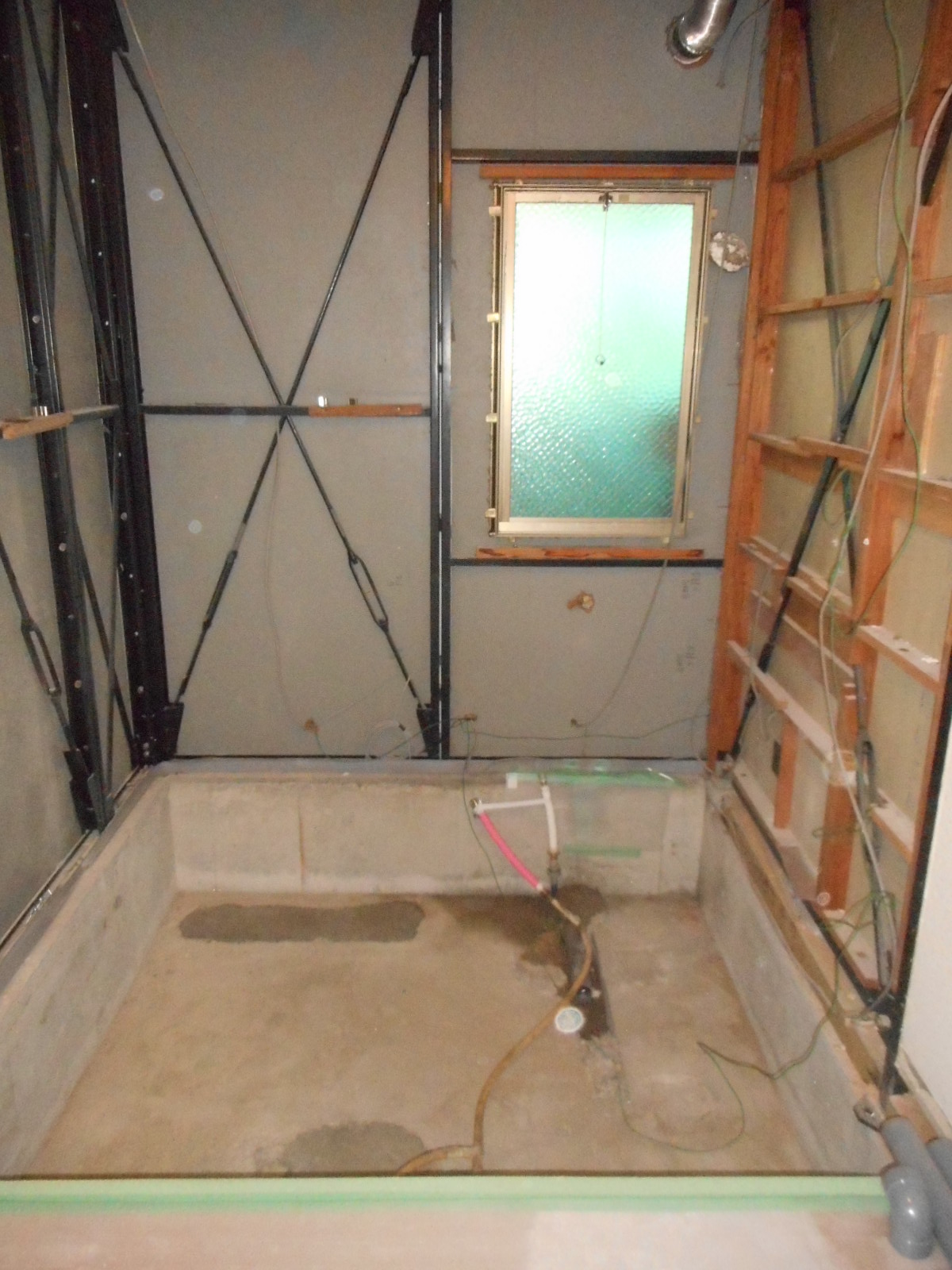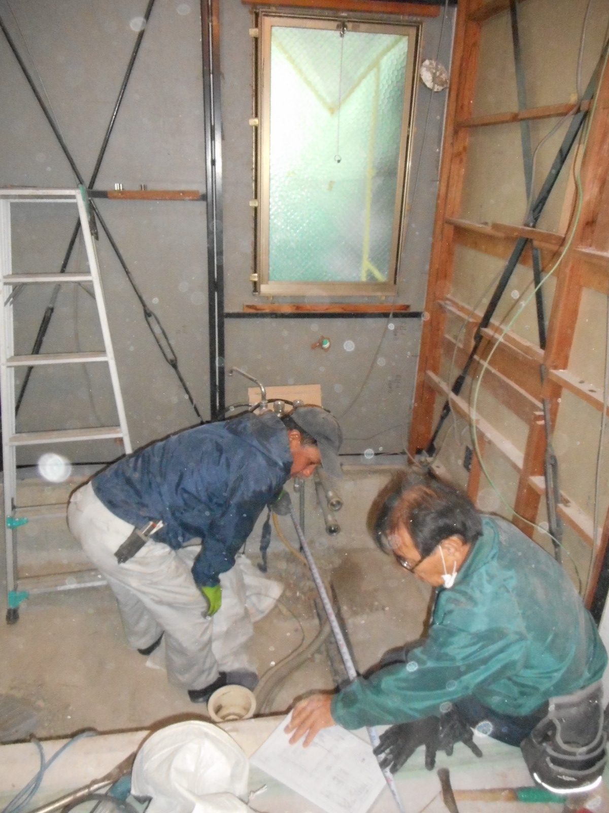 | 既存のシステムバスを、解体します!! | 洗面所側に広げる分、洗面所の床をカットします!! |