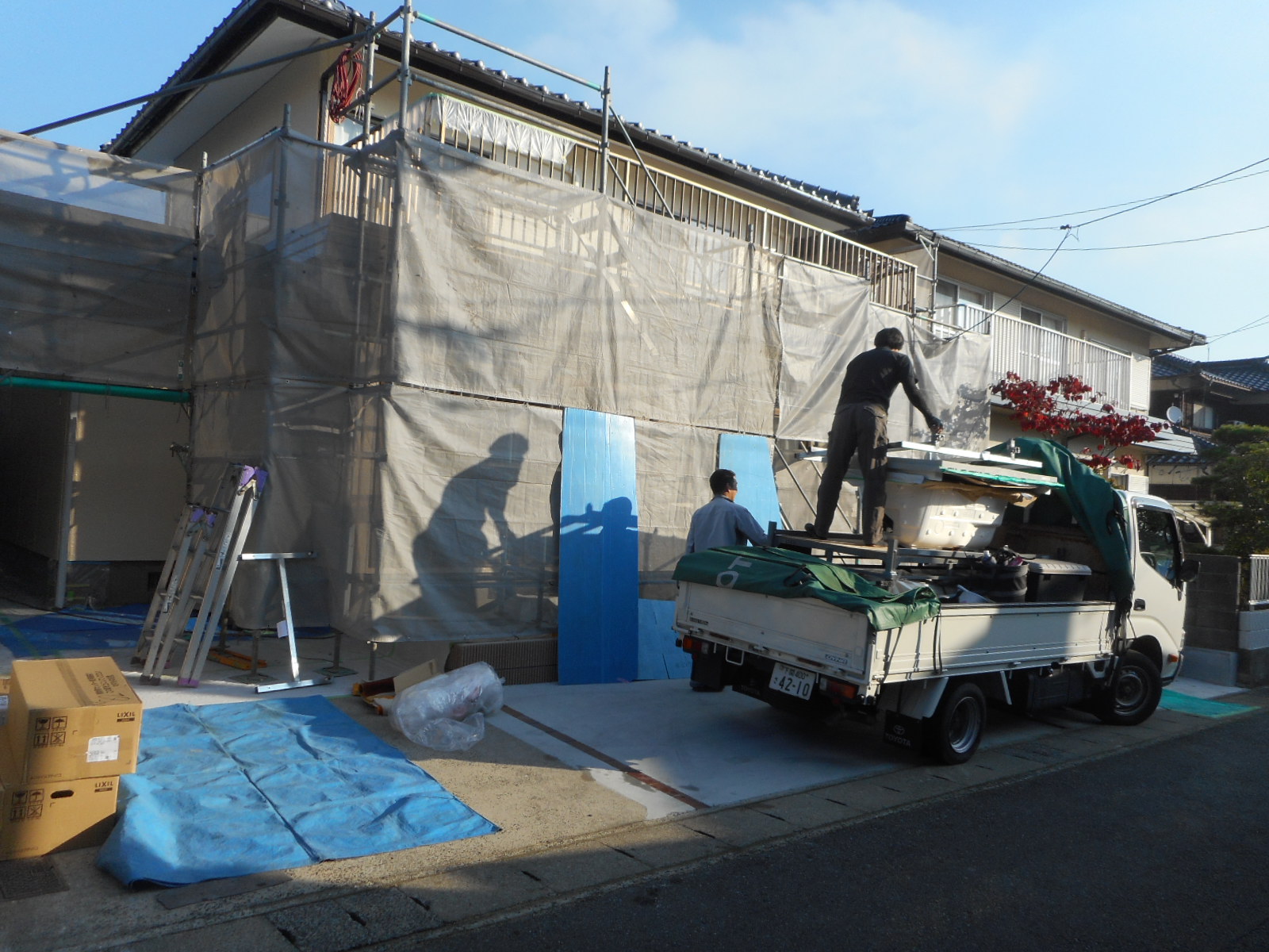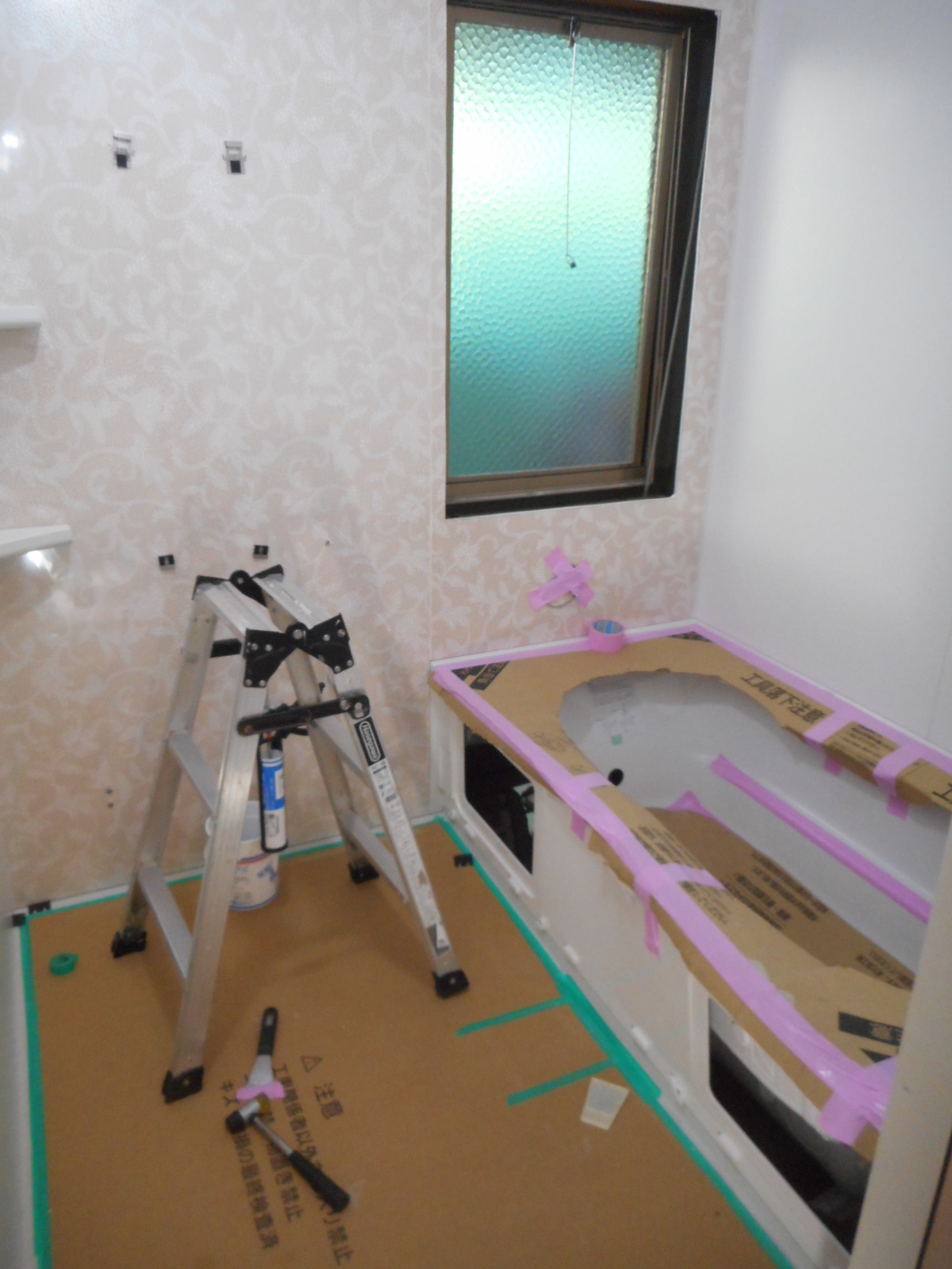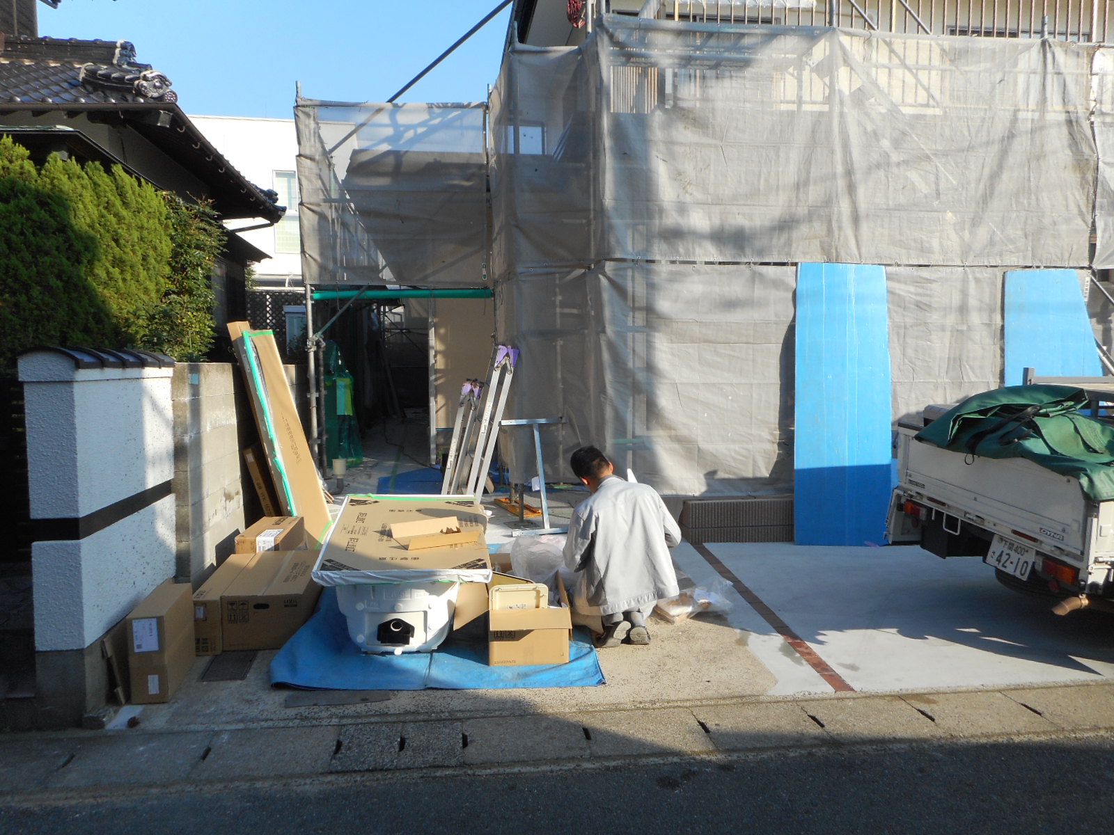 | 新規のシステムバスの部材が、到着しました!! (現場では、外廻りの塗装も行っています) |